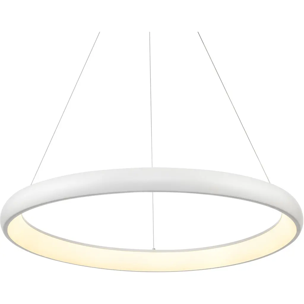 A curved band of powder-coated aluminum arcs around a central void forming and encapsulating an illuminated ring. Held within the perimeter structure of the CORTANA pendant is a circumferential LED light array spreading uniform radiance via the polymeric diffuser loop. Available in multiple sizes.