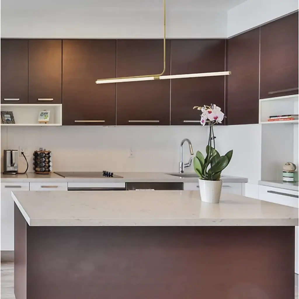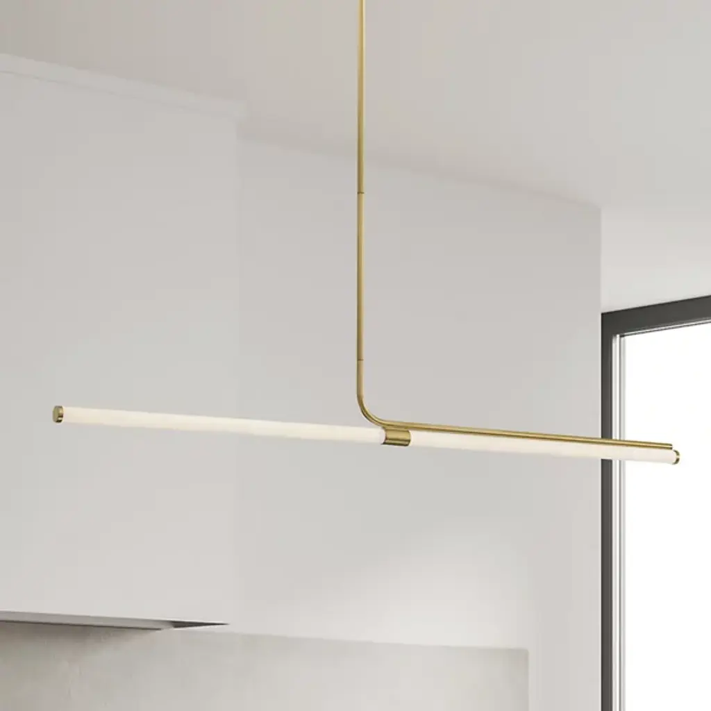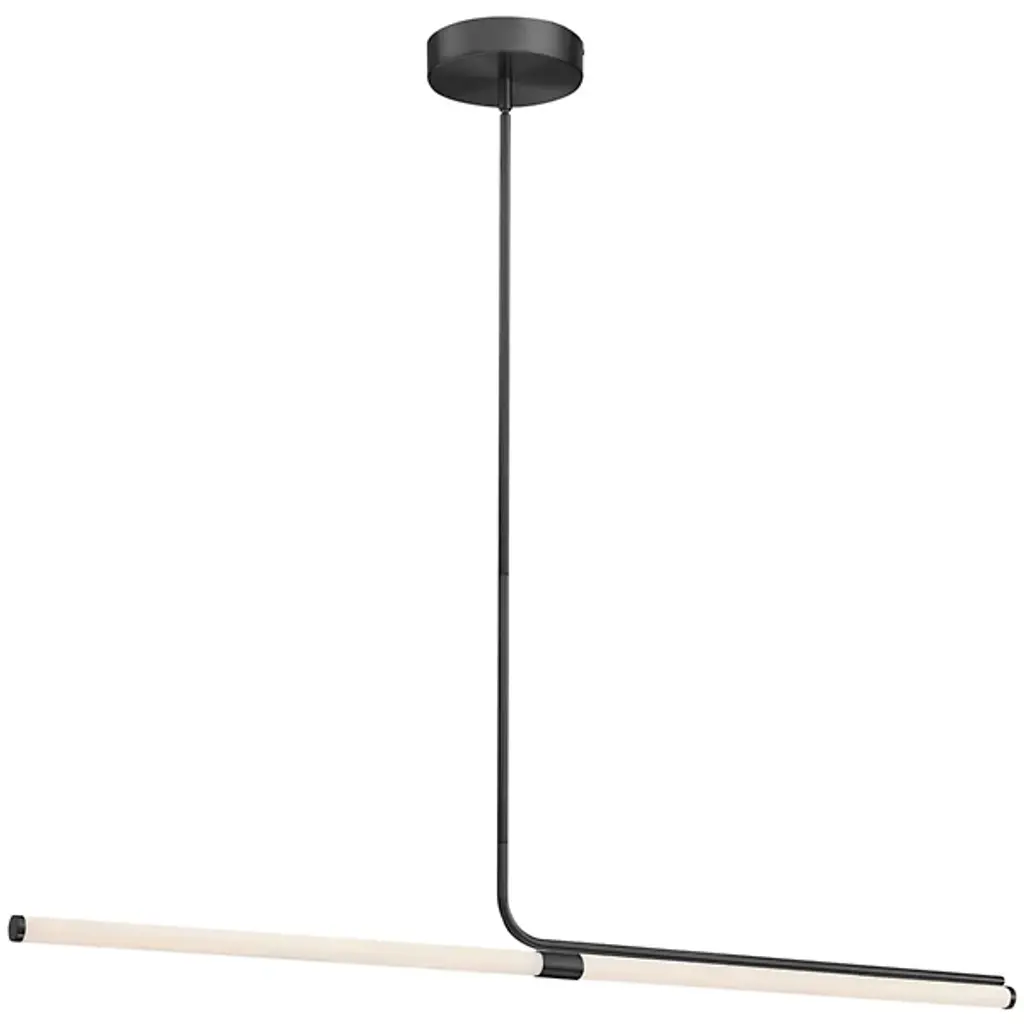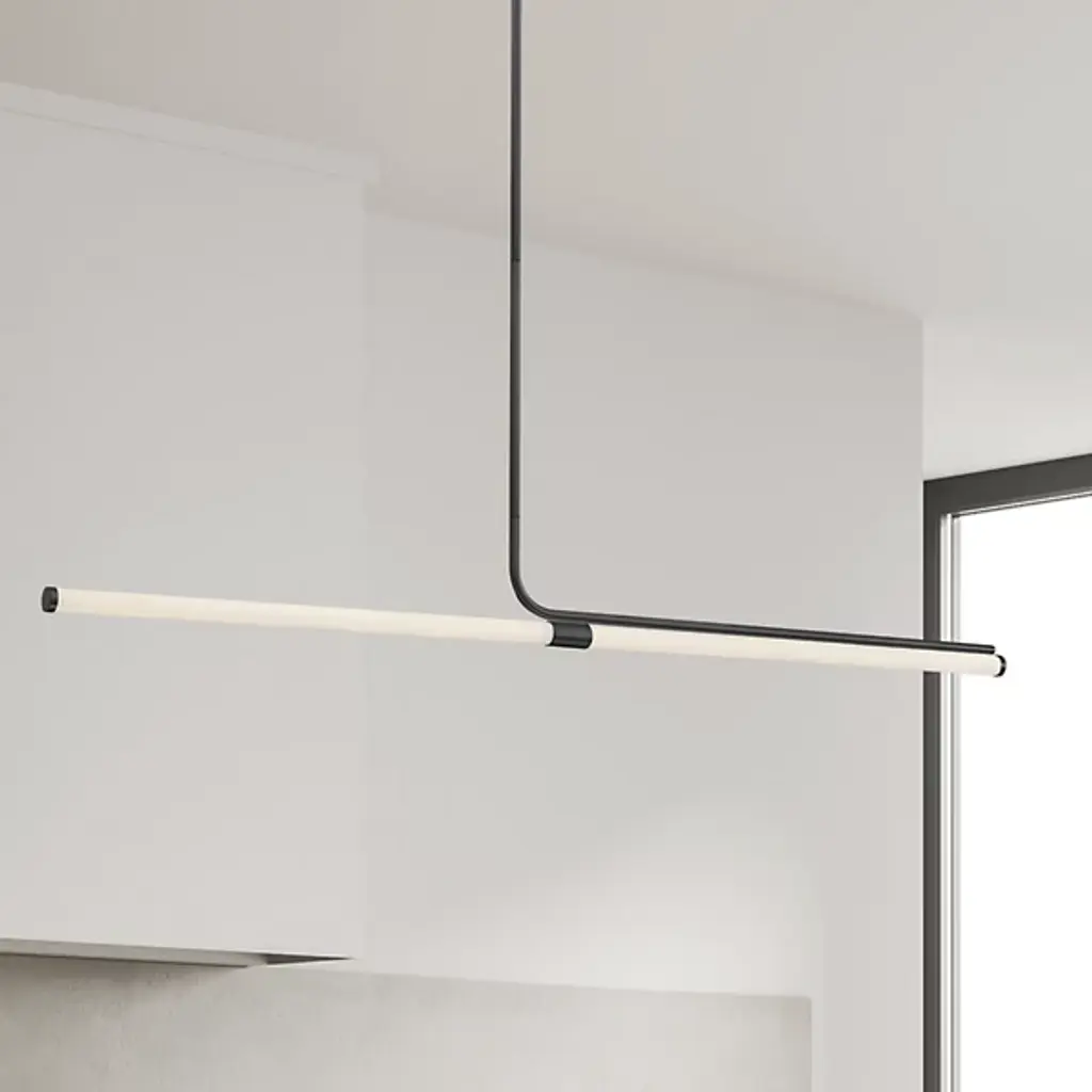 A sleek and unique lighting look for minimalist kitchens or dining areas. The Corvette LED Pendant by Dainolite is long and lean, with 2 acrylic tubes connected by a cylindrical metal hub. A bent metal rod supports the entire piece and adds distinctive adornment as it extends over the top of one of the tubes. The acrylic diffuses LED light along its full length, which is what enables this pendant to project plentiful ambience all around a room.