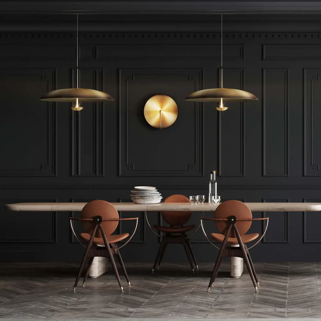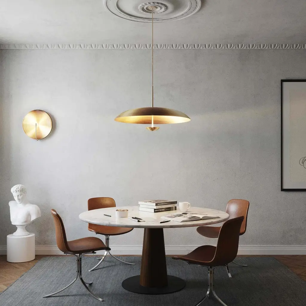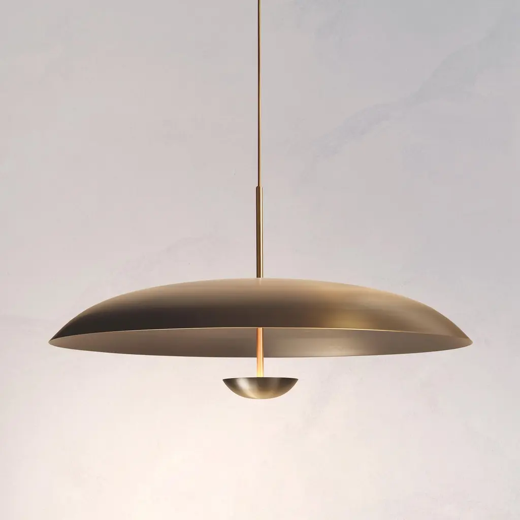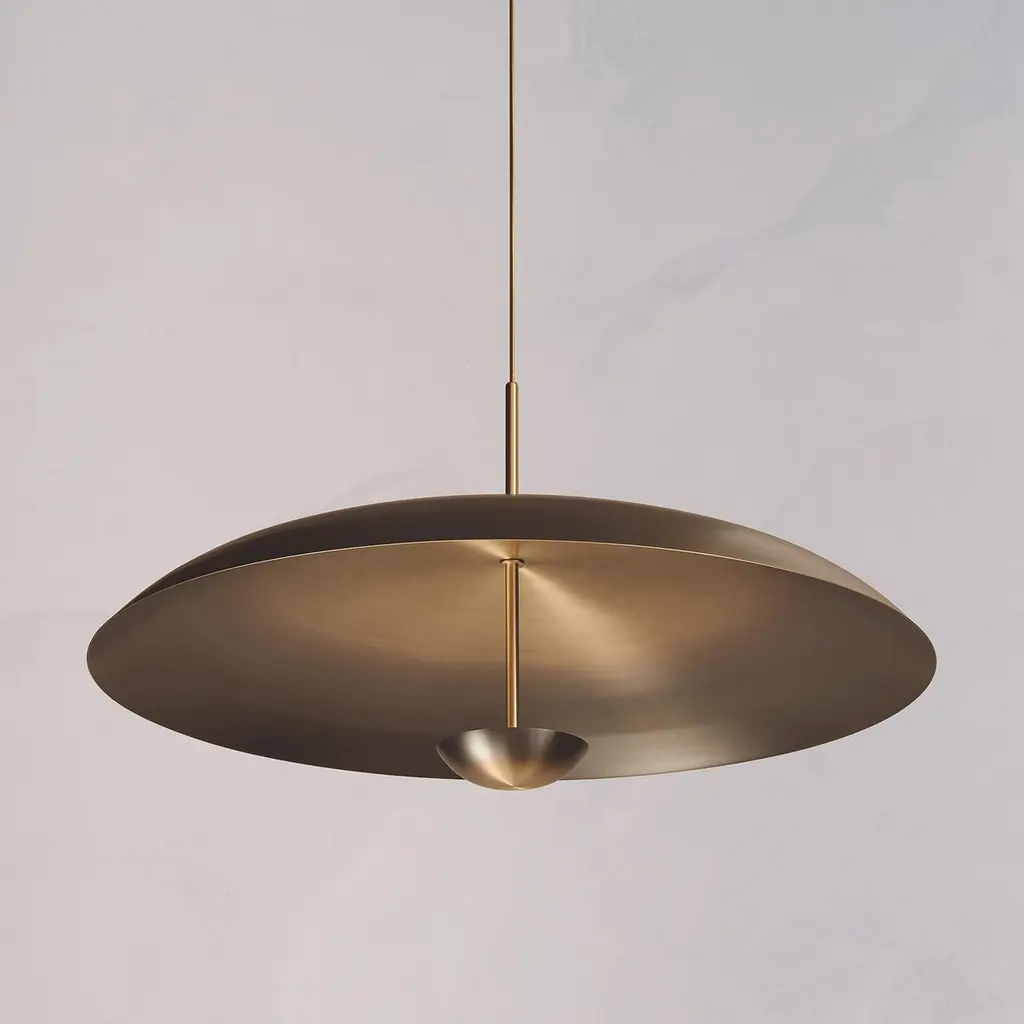 Inspired by planetary forms and textures, Atelier001's Cosmic Collection artfully explores the interplay of metal properties with a curated selection of patina finishes.This pendant light is crafted from two finely hand-spun brass plates, with a striking bronze-to-brass gradient that accentuates its sculptural form. The light is projected into the shade and reflected outward, providing illumination without causing glare.Designed to complement both contemporary and vintage-inspired interiors, each fixture is individually finished by hand, making every piece unique. Softly illuminated with advanced LED technology, this piece combines elegance with efficiency.Made in London.SpecificationsDimensions:Diameter: 100cm (39.4")Height: 52cm (20.5")Materials:Gradient patinated brass shadeSatin brass frameworkIllumination:Integrated LED (no bulb required)LED colour temperature: 2700KDimmable LED driverOutput: 700mA, 17W, 1500lmInput: 120/240VCertifications:CE certifiedUL listing available at a surcharge