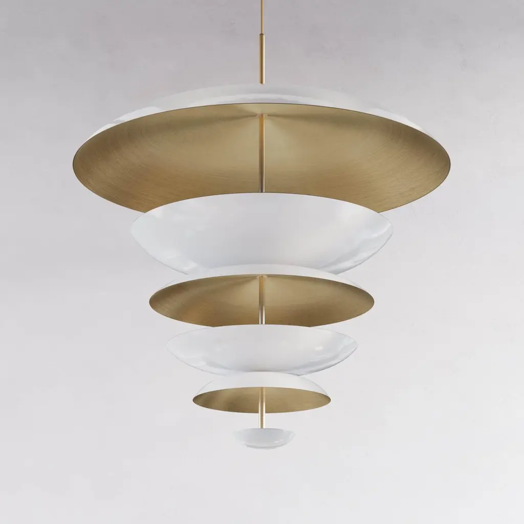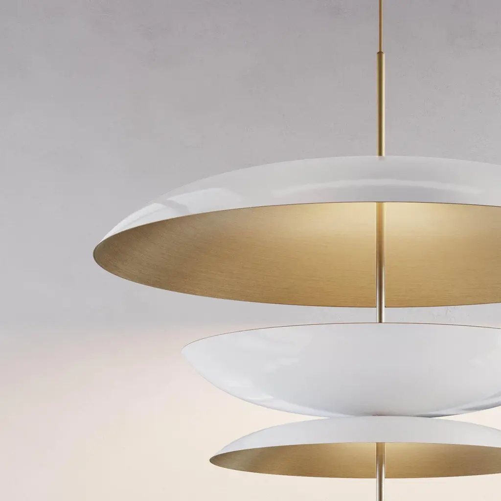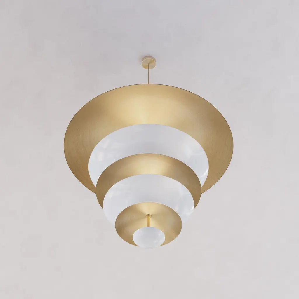 Finely hand-spun brass plates make up this pendant light. One side is finished in either a gloss white or matt white piano lacquer and the inside finely brushed brass. The light is projected into the shade and reflects out, illuminating without creating a glare.This light fixture is suitable for both contemporary and vintage inspired interiors, very sculptural and each a unique being finished by hand. It is softly illuminated with LED lighting technology. Made in London.Dimensions:Dia. 100cm (39.4"), height 108cm (42.5")Weight:40kg (88.2lbs)Materials:White lacquered brass shadeSatin brass frameworkPlease note that each piece is finished by hand and will vary slightly in its patterns and textures. Illumination:Integrated LED (No bulb required) LED colour temperature 2700K LED dimmable driverOutput 700mA 90W 4500lmInput 120/240V50,000 hours rated lifeCeiling mounted.Driver to be integrated into ceiling. Suspension cable 3m (118") to be cut to size. All components supplied. Region:CE certified; US Listing available at a surcharge.