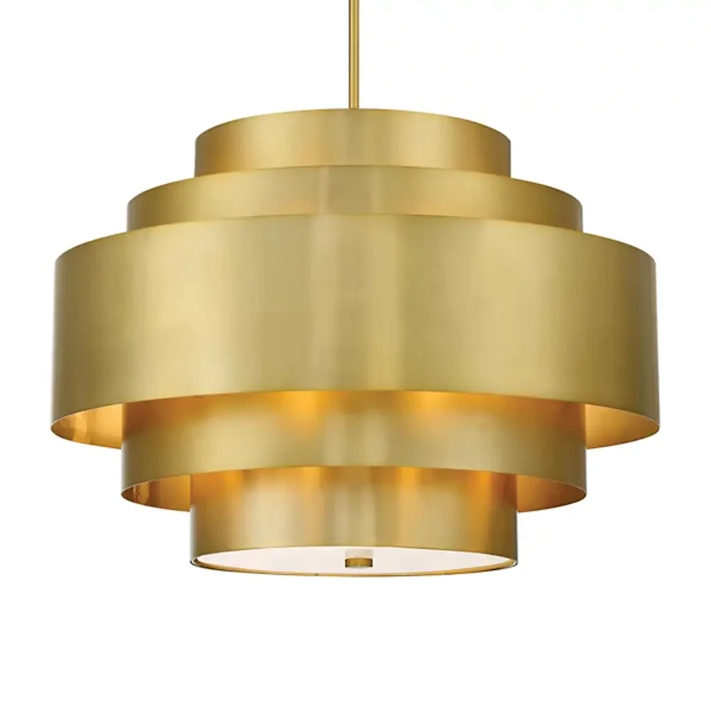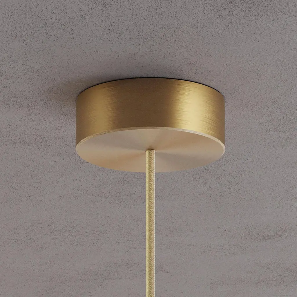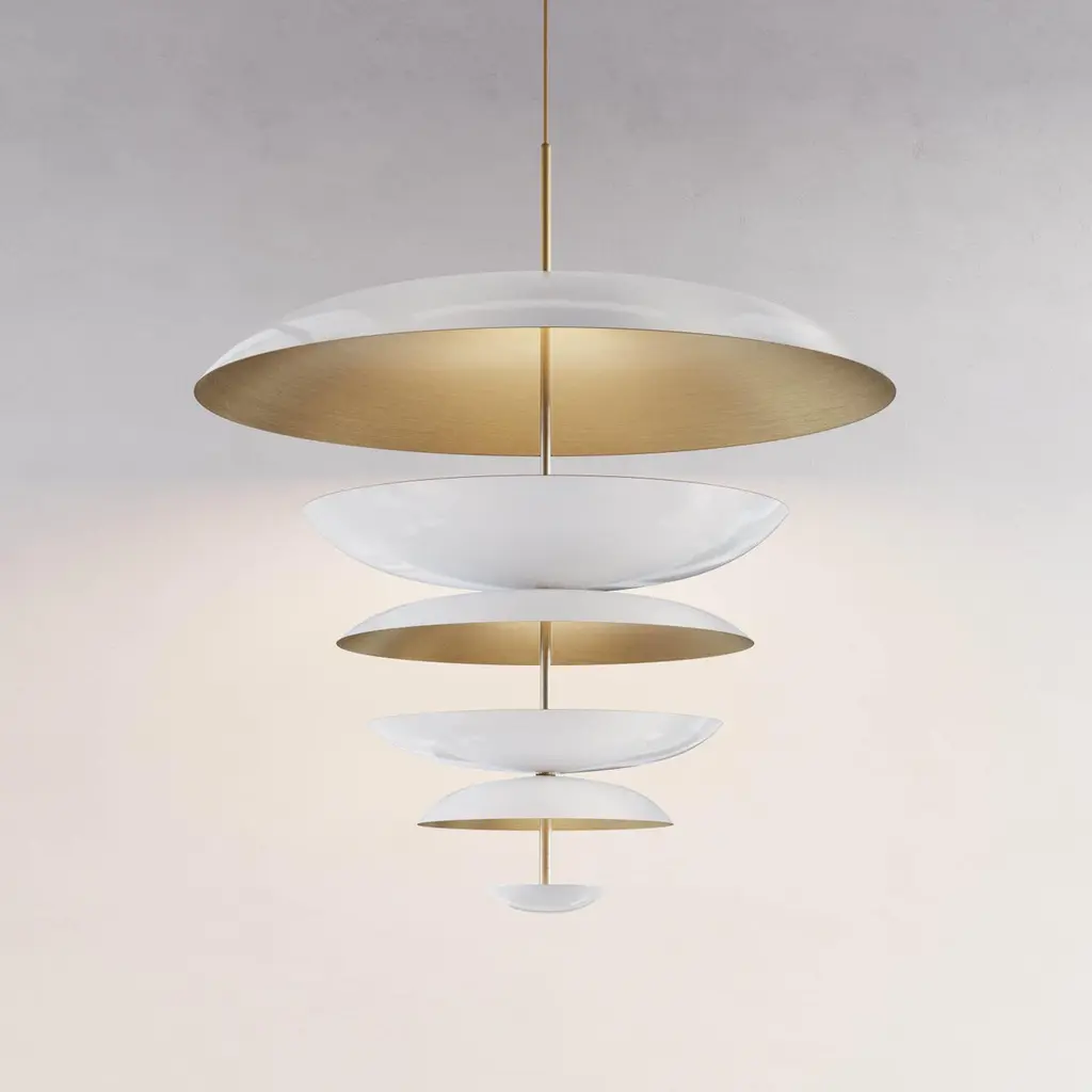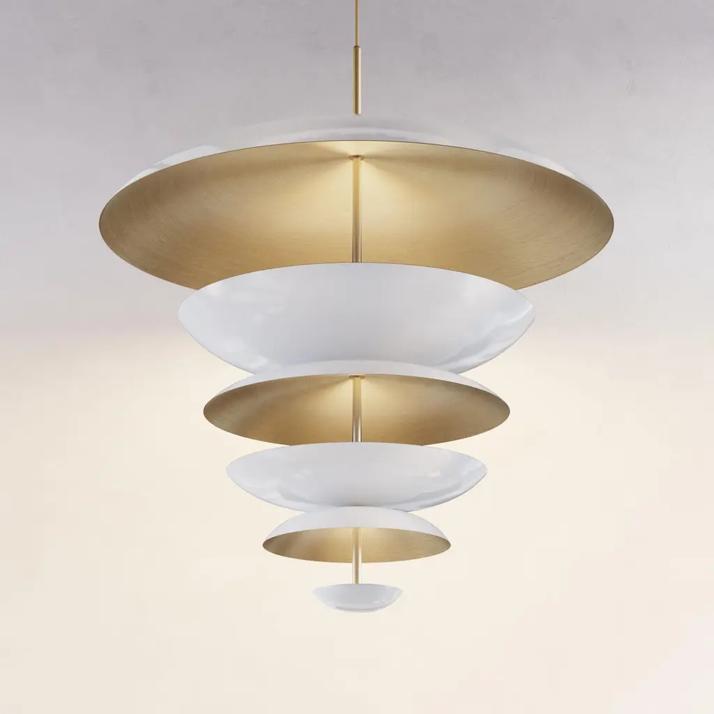 Finely hand-spun brass plates make up this pendant light. One side is finished in either a gloss white or matt white piano lacquer and the inside finely brushed brass. The light is projected into the shade and reflects out, illuminating without creating a glare.This light fixture is suitable for both contemporary and vintage inspired interiors, very sculptural and each a unique being finished by hand. It is softly illuminated with LED lighting technology. Made in London.Dimensions:Dia. 100cm (39.4"), height 108cm (42.5")Weight:40kg (88.2lbs)Materials:White lacquered brass shadeSatin brass frameworkPlease note that each piece is finished by hand and will vary slightly in its patterns and textures. Illumination:Integrated LED (No bulb required) LED colour temperature 2700K LED dimmable driverOutput 700mA 90W 4500lmInput 120/240V50,000 hours rated lifeCeiling mounted.Driver to be integrated into ceiling. Suspension cable 3m (118") to be cut to size. All components supplied. Region:CE certified; US Listing available at a surcharge.
