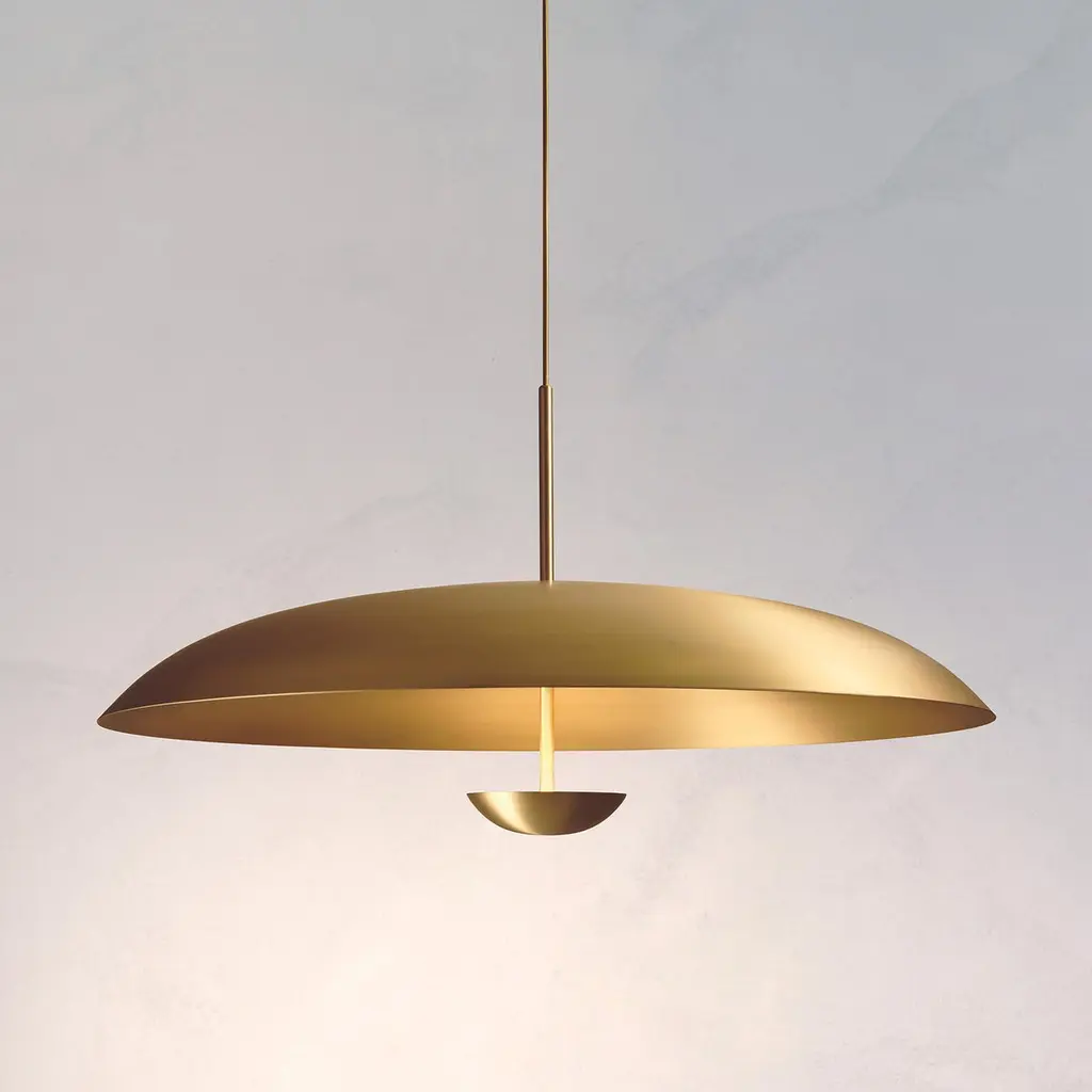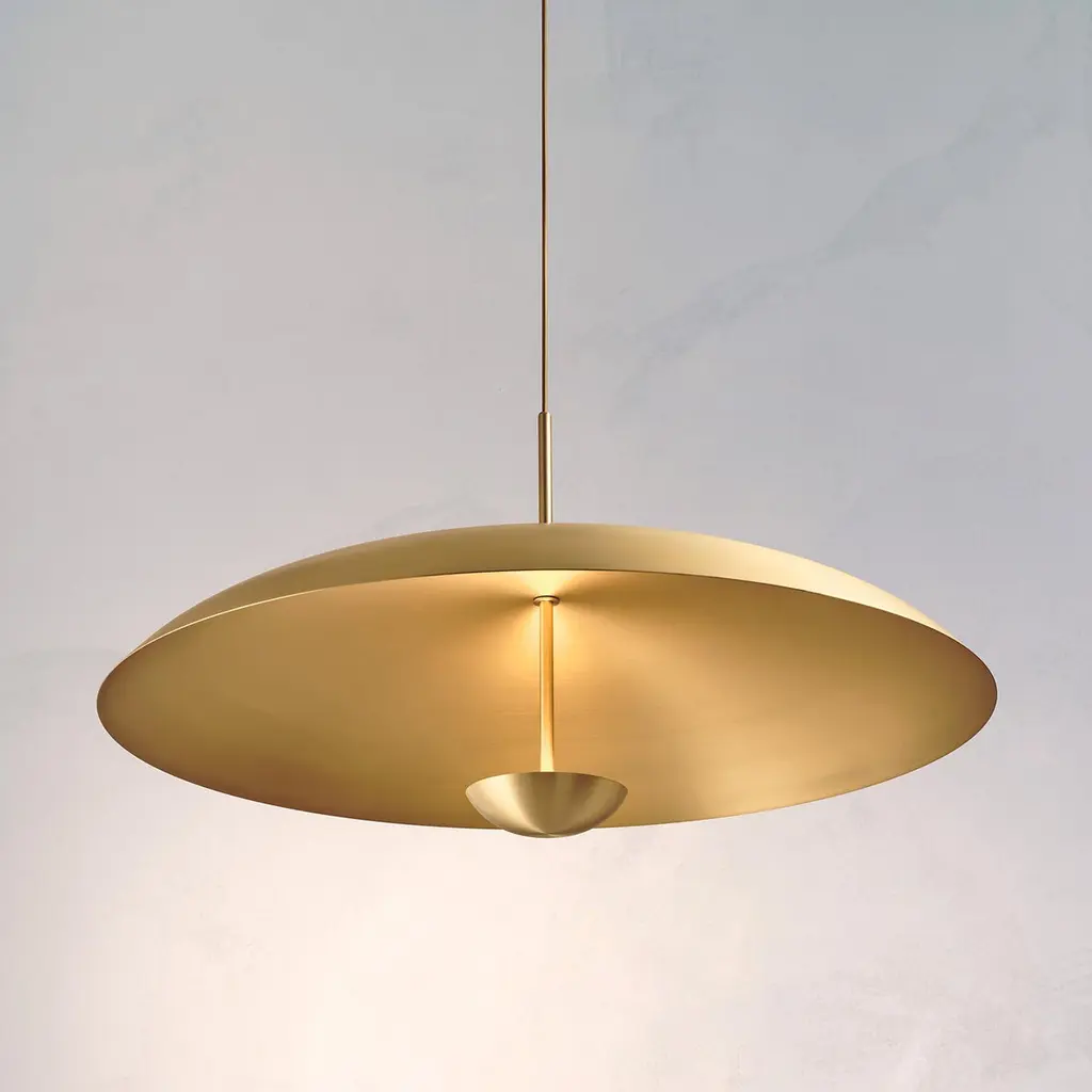 Composed by two carefully hand-spun brass plates, the Sol Pendant preserves the beautiful texture and quality of fine brass. Light is projected into the shade before reflecting out, illuminating without creating a glare. This light fixture is suitable for both contemporary and vintage inspired interiors, very sculptural and each a little variant being finished by hand. It is softly illuminated with LED lighting technology. Handmade in London.Dimensions: Diameter 100cm (39.4"), height 52cm (20.5")Materials:Satin brass framework Hand-spun brass plateFinish:Satin Brass;Please note that each piece is finished by hand and will vary slightly in its patterns and textures.Illumination:Integrated LED (No bulb required)LED colour temperature 2700KLED dimmable driverOutput 700mA 17W 1500lmInput 120/240V50,000 hours rated lifeCeiling mounted.Driver to be integrated into ceiling. Suspension cable 3m (118") to be cut to size. All components supplied.Region:CE certified; UL listing available at a surcharge.