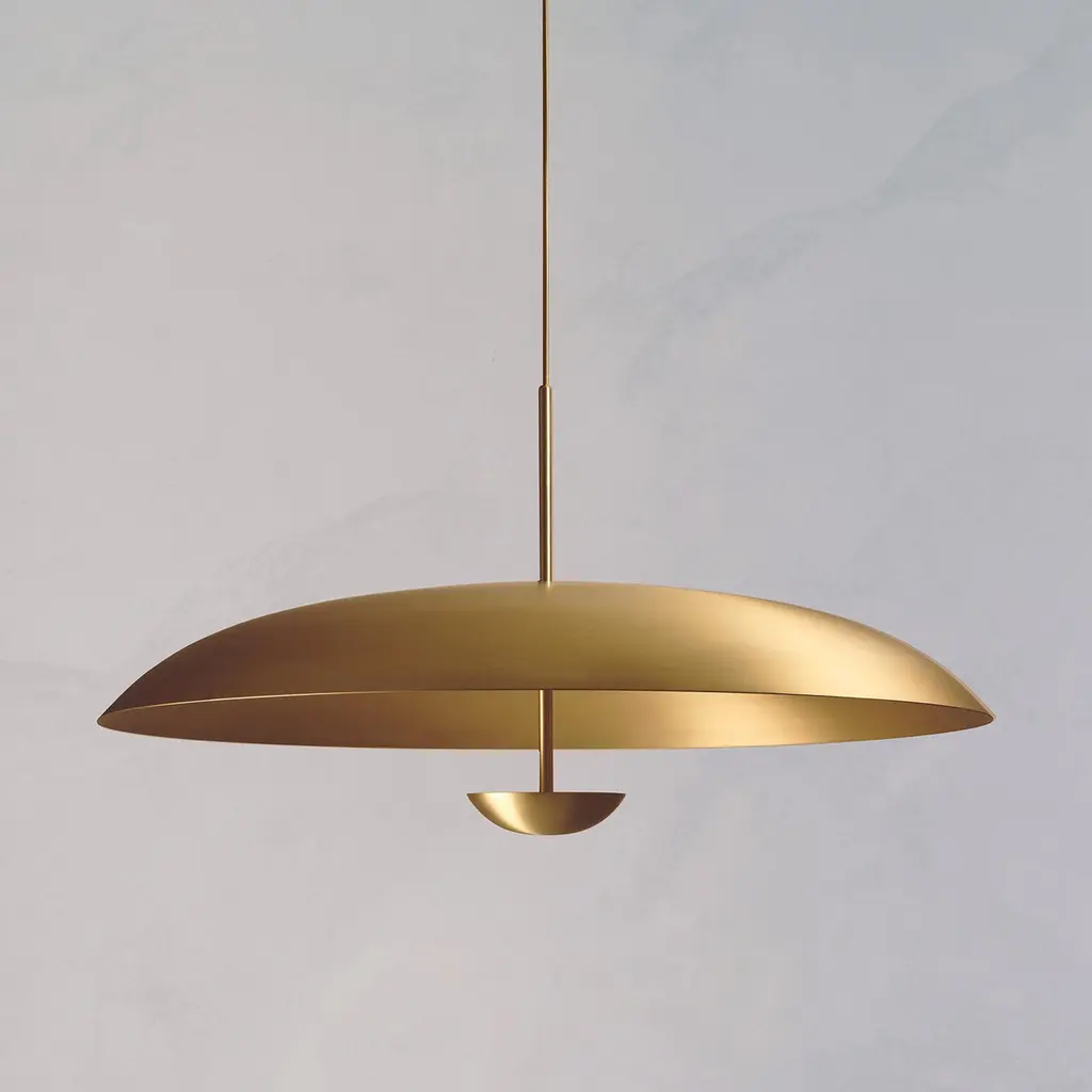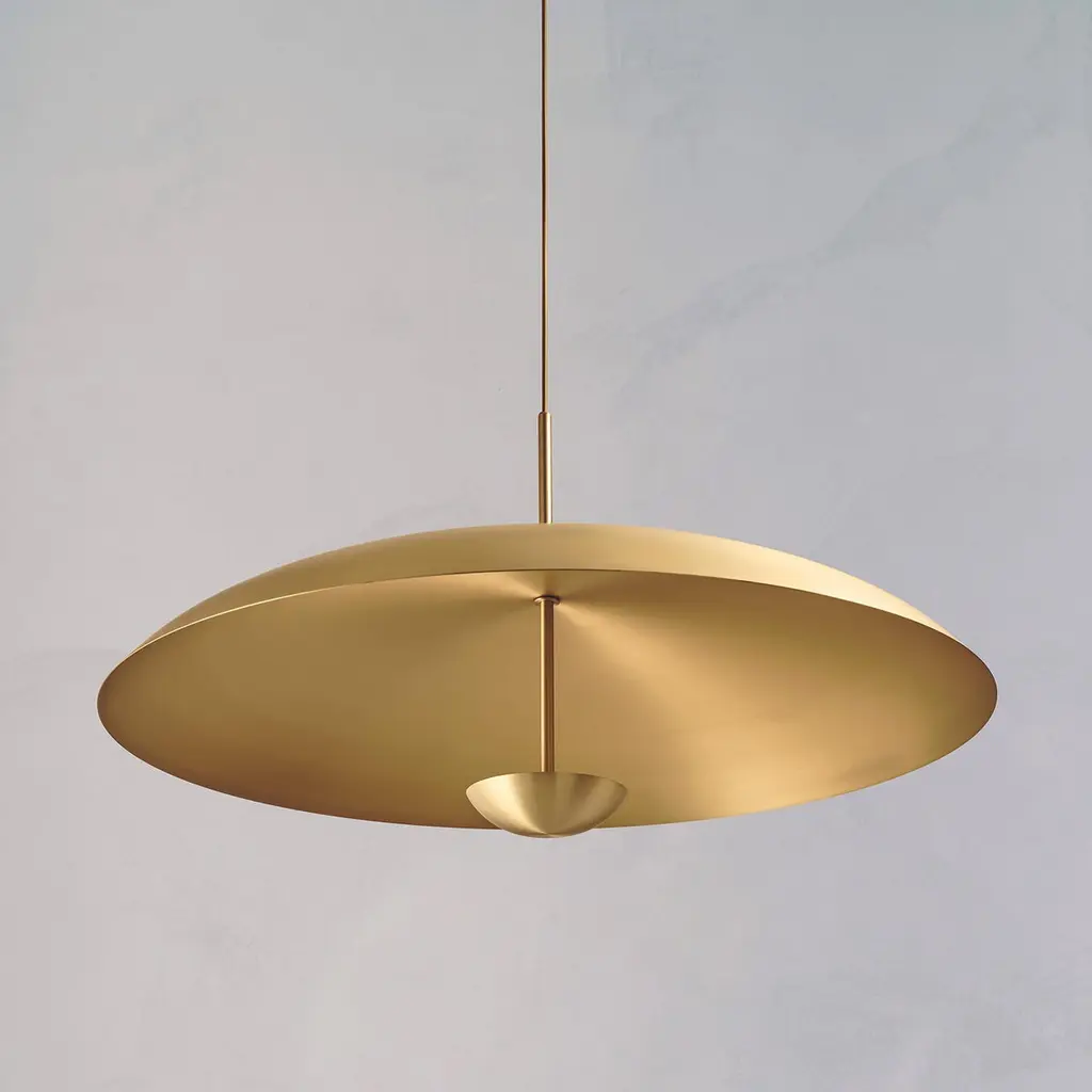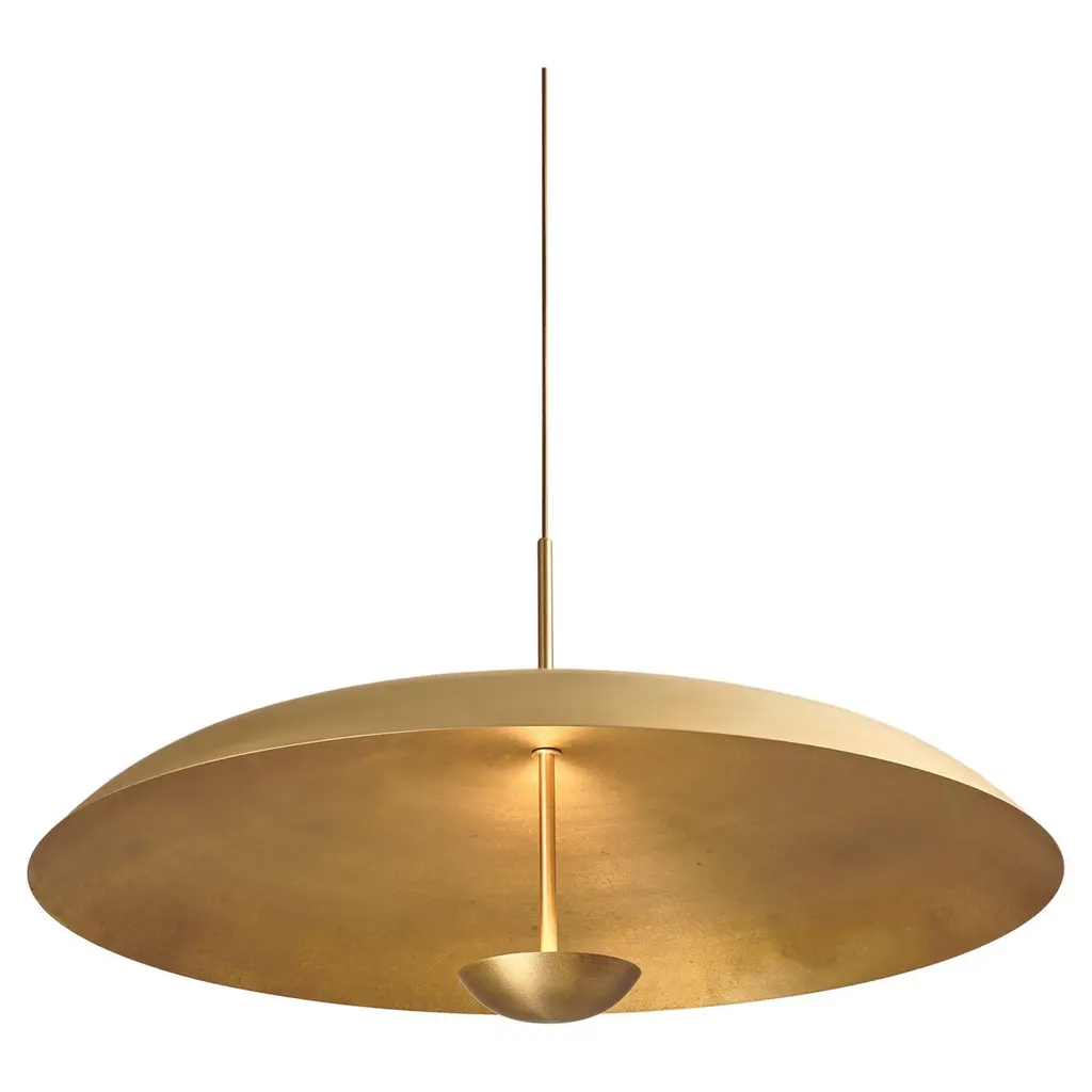 Composed by two carefully hand-spun brass plates, the Sol Pendant preserves the beautiful texture and quality of fine brass. Light is projected into the shade before reflecting out, illuminating without creating a glare. This light fixture is suitable for both contemporary and vintage inspired interiors, very sculptural and each a little variant being finished by hand. It is softly illuminated with LED lighting technology. Handmade in London.Dimensions: Dia. 70cm (27.5”), height 42cm (16.5”)Materials:Satin brass framework Hand-spun brass plateFinish:Satin Brass;Please note that each piece is finished by hand and will vary slightly in its patterns and textures.Illumination:Integrated LED (No bulb required)LED colour temperature 2700KLED dimmable driverOutput 700mA 17W 1500lmInput 120/240V50,000 hours rated lifeCeiling mounted.Driver to be integrated into ceiling. Suspension cable 3m (118") to be cut to size. All components supplied.Region:CE certified; UL listing available at a surcharge.