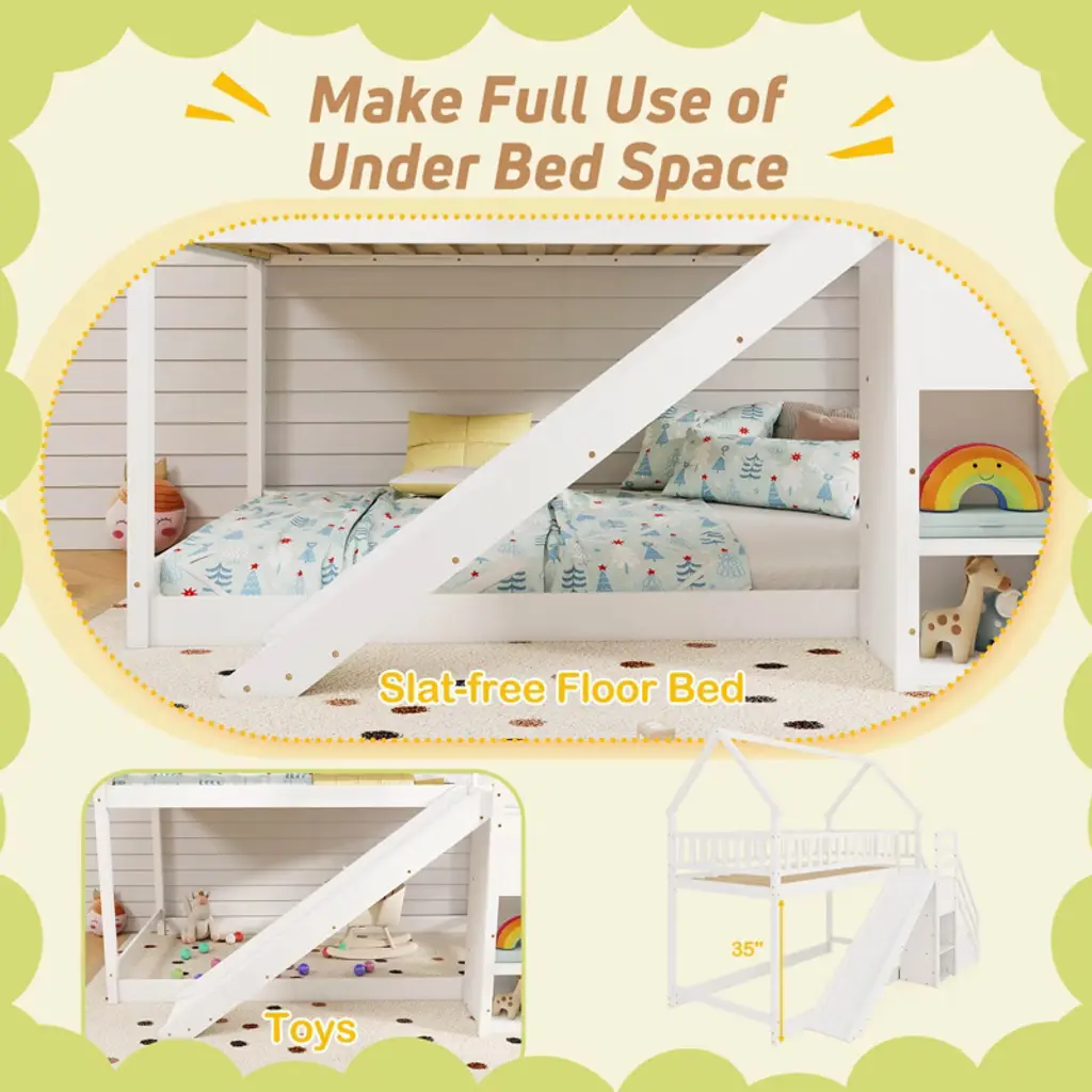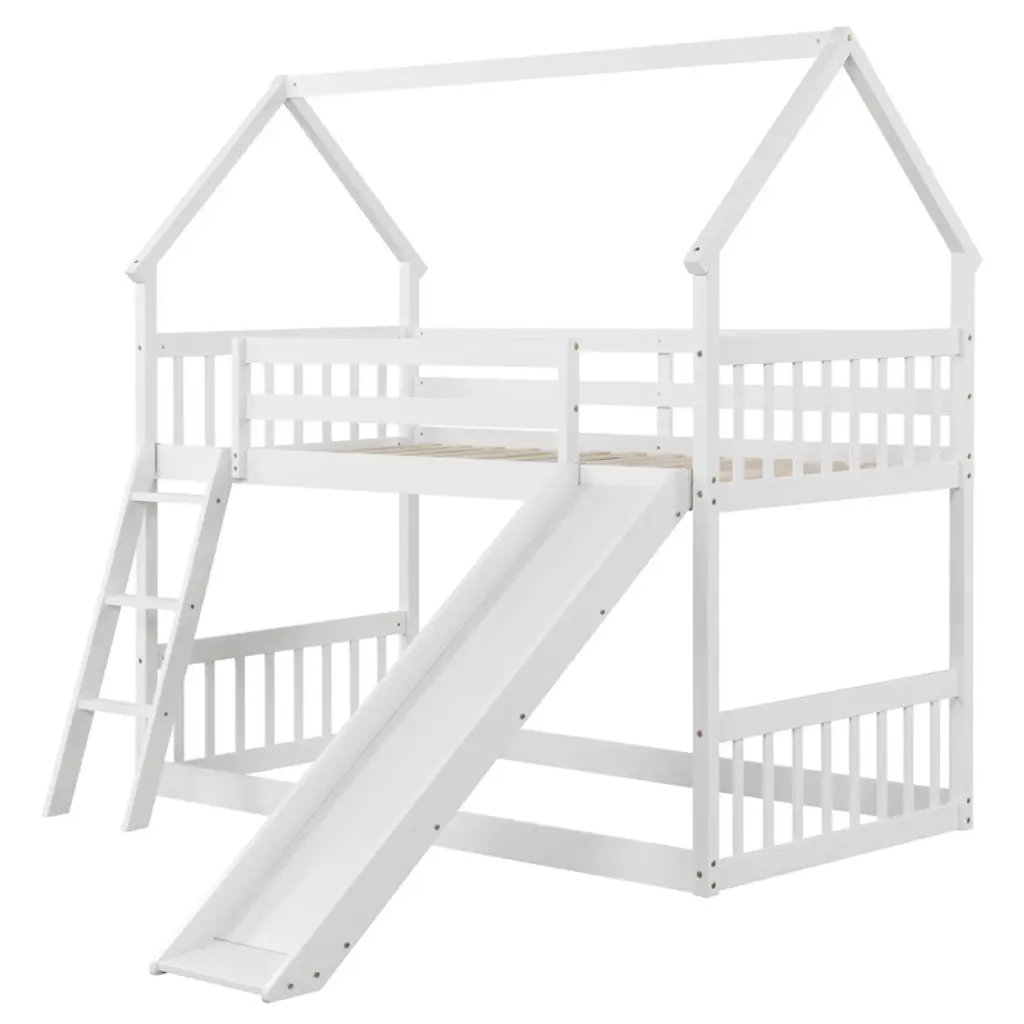 Transform your child's room with our enchanting twin-over-twin loft bed. Designed like a quaint little house and equipped with its own slide, this bed ensures endless fun and creativity. The space underneath? Perfect for storing toys or becoming a secret hideout! It's not just about fun; it's also about safety and convenience. Climb up safely using the sturdy staircase—doubling as clever storage with shelves and compartments. No box spring needed, just place any mattress up to 6 inches thick and watch your little one drift into dreamland, surrounded by a protective full-length guardrail. Exhibit practical elegance in your child's bedroom with this house loft bed!FeaturesDecorative house-shaped frame for hanging lights, banners, or photos Staircase with 3 large compartments and 2 open shelves for storage Includes a fun slide for easy descent from the bed Make full use of under-bed space for sleeping or playing Full-length safety guardrail prevents falling accidents Equipped with 14 wooden slats for a safe and stable structure Solid wood support frame provides long-term support Comes in 2 boxes; the time of receipt may varyColor: White/Gray Material: Pine Wood, Plywood Wood, Engineered Wood Overall Dimensions: 103.5" x 57" x 80" (L x W x H) Dimensions of Upper Bunk: 76" x 39" (L x W) Bed Guardrail Height: 12.5" Upper Bunk above Ground: 35" Dimensions of Slide: 63" x 13" (L x W) Dimensions of Open Shelves: 15" x 13.5" x 9.5"/11.5" (L x W x H) Dimensions of Staircase Step: 14.5" x 12"(W x H) Dimensions of Storage Compartment: 13" x 9.5" (W x H) Recommended Mattress: ≤6"Twin Size Weight Capacity of Upper Bunk: 250 lbs Weight Capacity of Slide: 200 lbs Weight Capacity of Staircase: 200 lbs Net Weight: 176.5 lbs Note: No children under 6 years old on upper bunk Package Includes: 1 x House Loft Bed with Slide & Stair 1 x User Manual