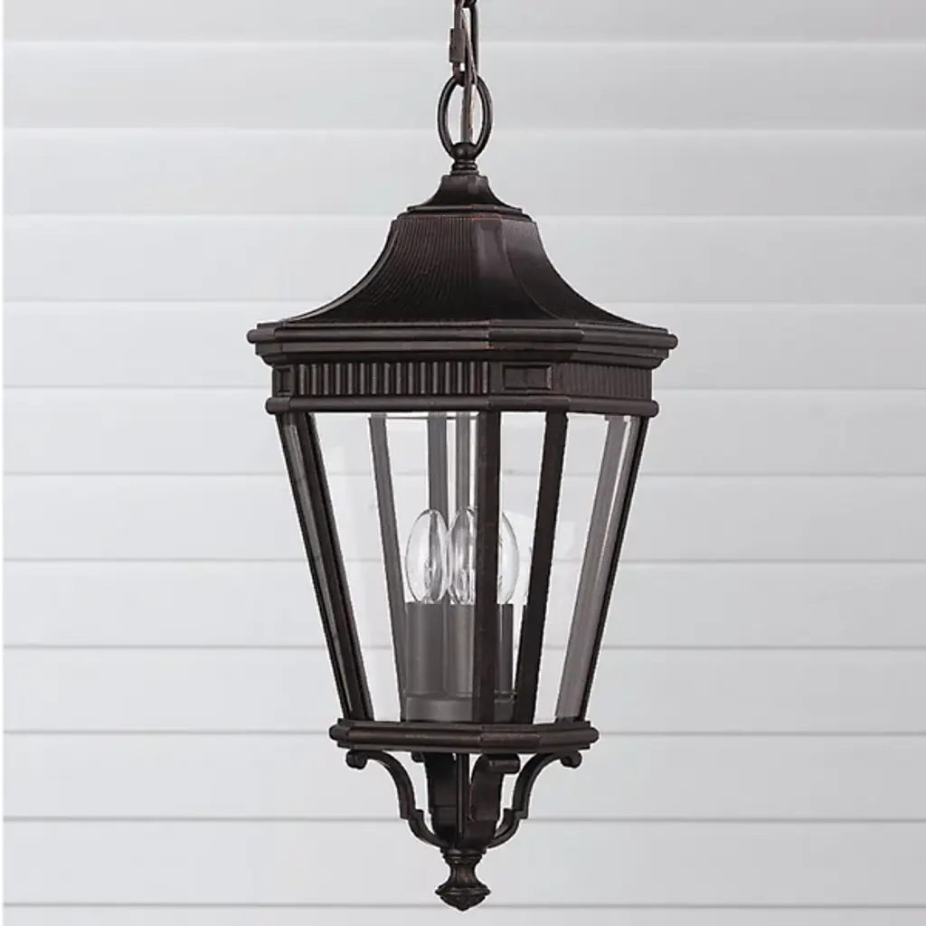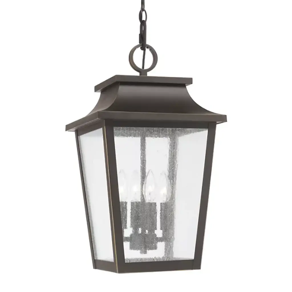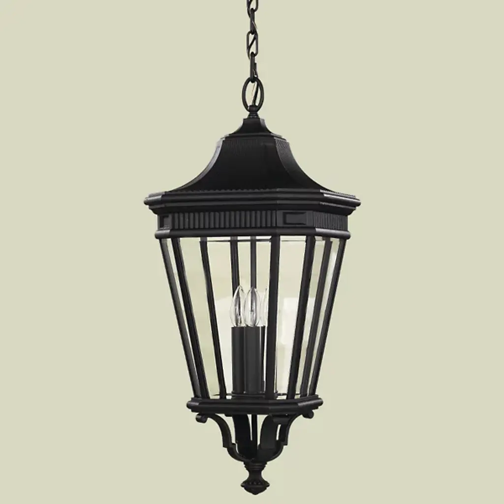 The Generation Lighting, formerly known as Feiss, Cotswold Lane Outdoor Pendant offers simple yet elegant lighting for the front entryway, its early American look strongly influenced by the beautiful English countryside of the Cotswolds. Clear beveled glass offers bright, welcoming light for a variety of home architecture styles.