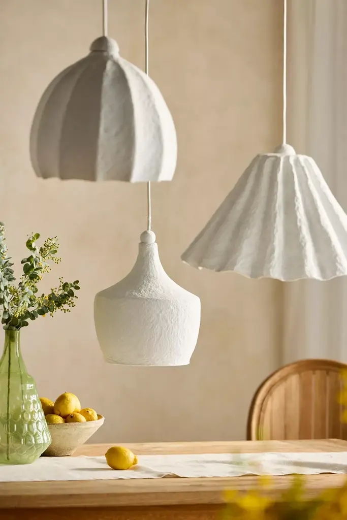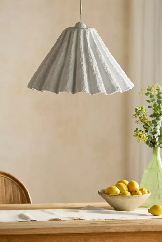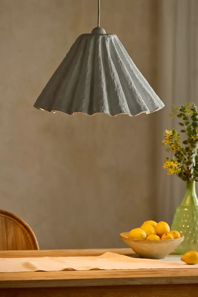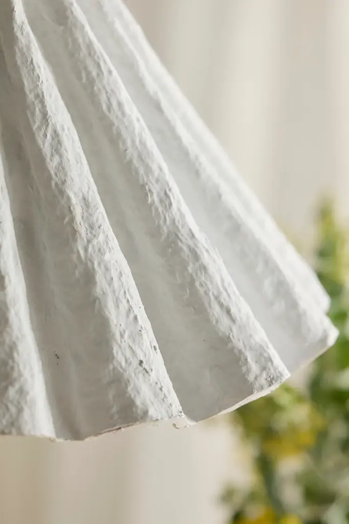 Handmade especially for terrain with a cotton mache shade, this minimalist pendant light features a flared silhouette with soft pleating.