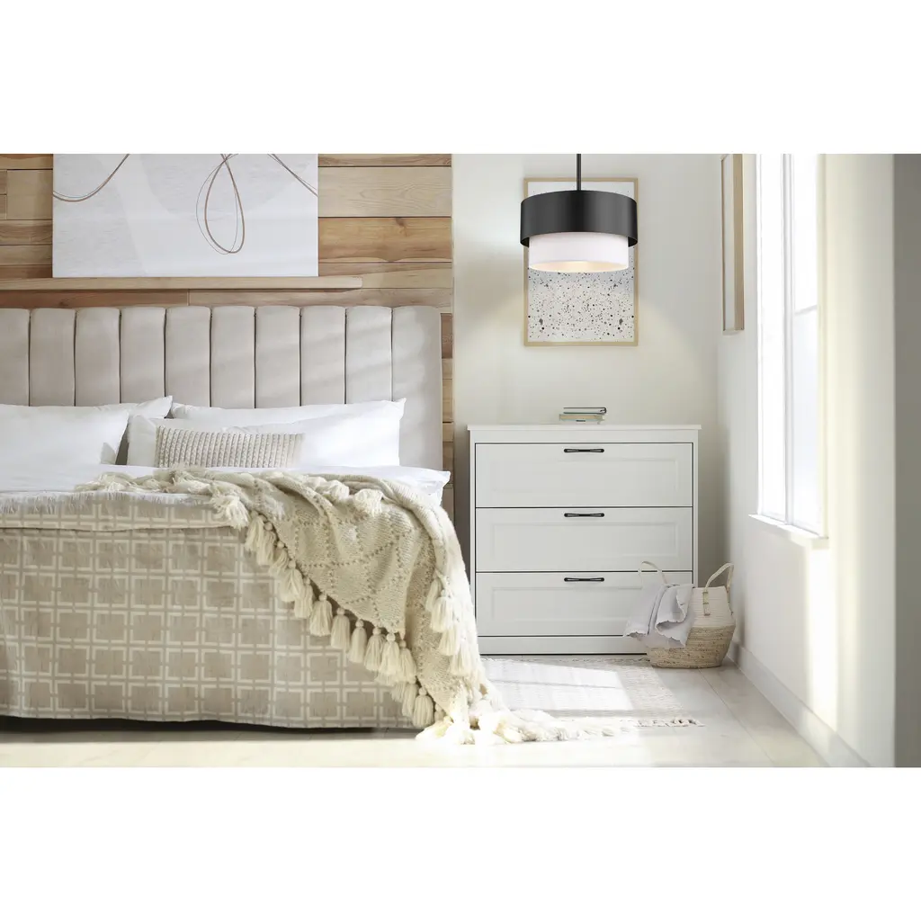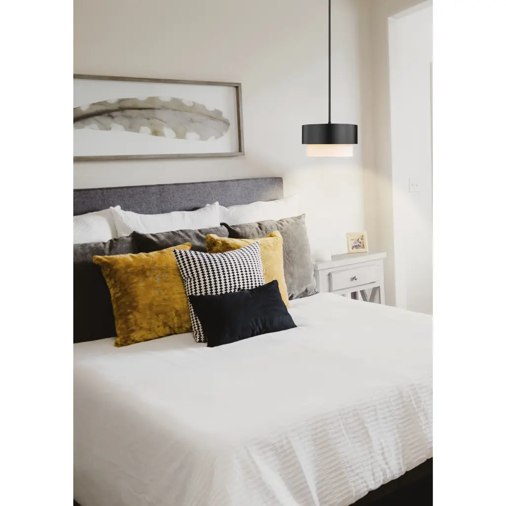 Unforgettable personality quirks follow the path of both Mid-Century Modern and Art Deco aesthetics in a stylish light fixture ideal for a kitchen, entryway, or main living area. Contemporary and transitional design schemes welcome this sleek pendant from the Counterpoint collection and make good use of an eclectic yet sensible style motif. Matte black finish steel framing and a soft white fabric shade adopt an optically pleasing circular silhouette that captures attention in any setting.