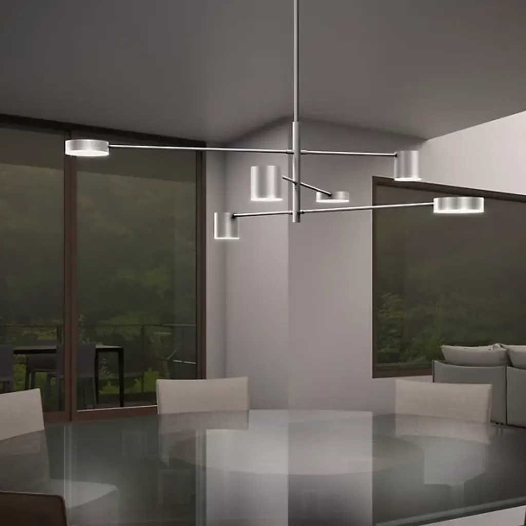 Reminiscent of an art mobile with layers of eye-catching visuals, the Counterpoint LED Pendant by SONNEMAN invites a dramatic luminous presence in a modern home or office setting. Composed of contrasting Aluminum discs and cylinders with Optical Acrylic lenses and integrated LED lighting, the showpiece pendant provides clear, downward illumination over a modern foyer, dining room, kitchen or boardroom.
