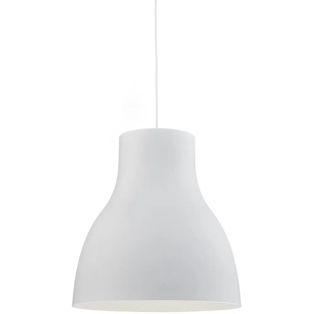 Single-lamp pendant with tapered aluminum shade showcasing powder-coated finishes. Exterior shade colors are either black, gray or white, with matte white interior. Suspended by cloth cable . Available in three sizes.