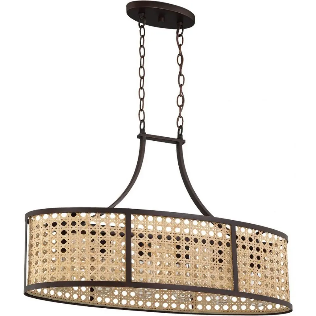 The Malaya Collection combines the warm, earthy tones and texture of real woven rattan with clean transitional silhouettes to create a global experience. Featuring an enlarged woven pattern captured within the rich aged bronze brushed finished cage, the rattan drums of assorted shapes and sizes combine to create a versatile collection welcome in any space. Natural rattan shade Requires 6 medium base, 60 watt bulbs (not included) 6' chain and 10' cord included 1 year limited warranty. Warranty: 1 Year Limited Canopy Included: Yes Shade Included: Yes Canopy Diameter: 8.35 x 0.91