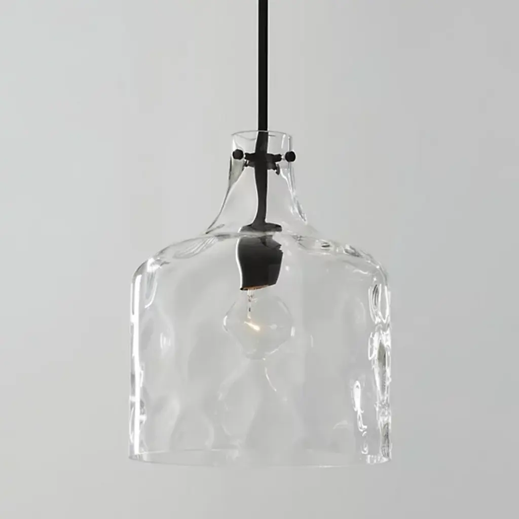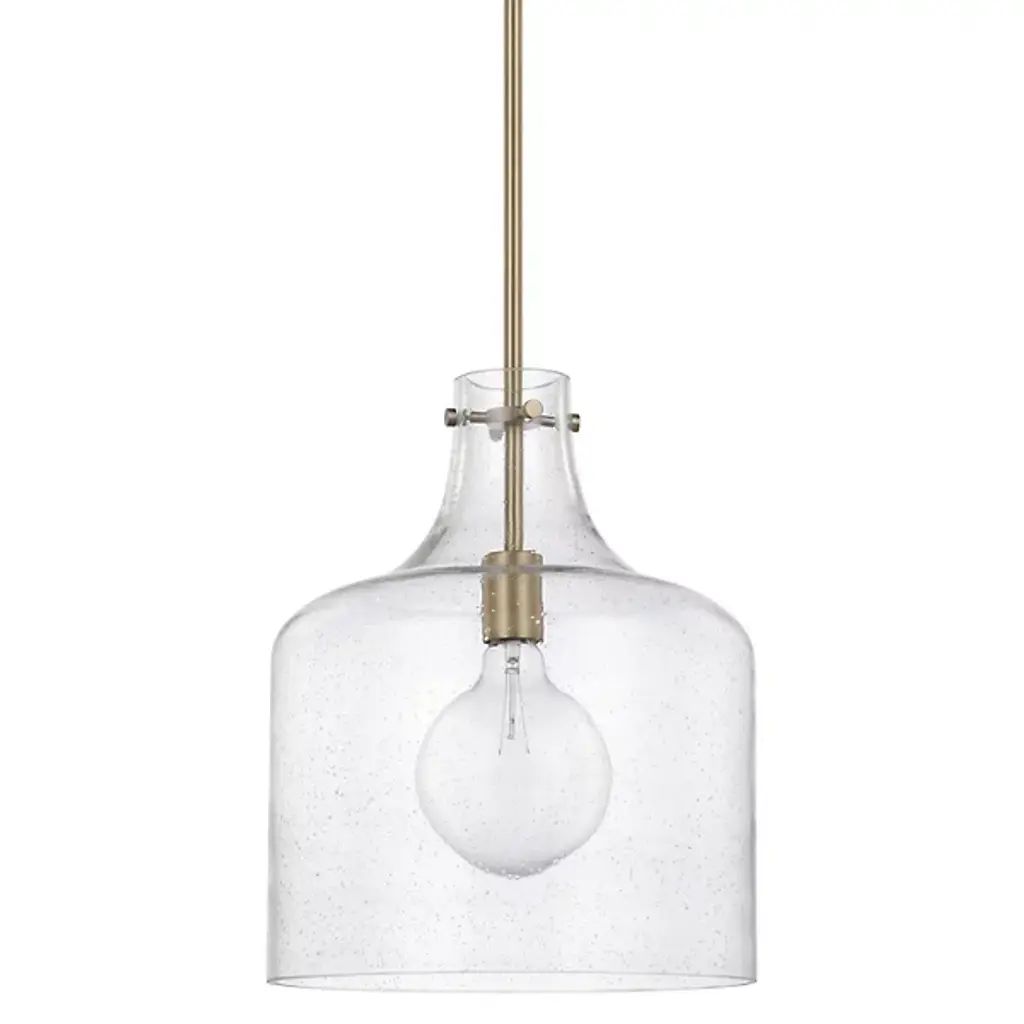 The Crawford Pendant from Capital Lighting makes a graceful first impression with brief curves and a touch of detail. The pendant's shortlist of materials and shapes packs a visual punch. The thoughtful arrangement of these materials and shapes makes it a transitional design with an urban and industrial character. As a slim pendant, it looks good out in the open space on its own or in series over a table. It draws a charming silhouette in the air with a soft-curved glass shade. The clear seeded glass shade delights up close with fine texture. The textural elements transform into fine highlights as the lone bulb inside pushes out a warm ambient glow.