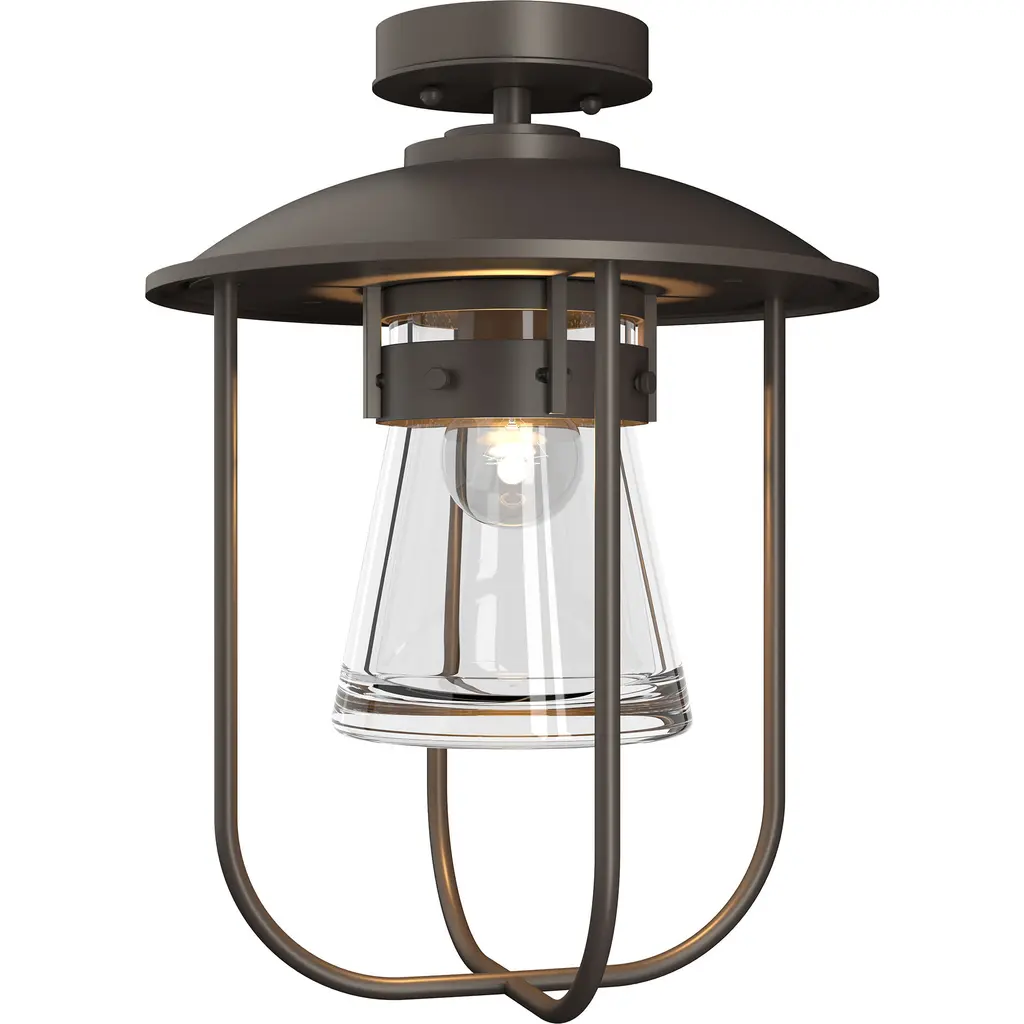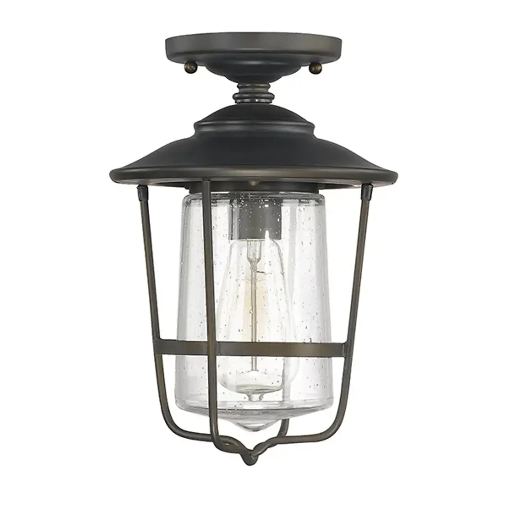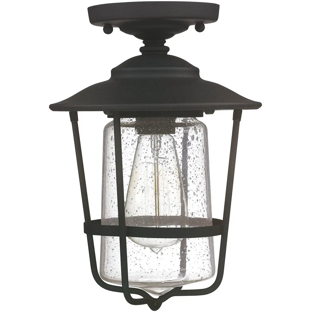 The Creekside Caged Outdoor Semi-Flushmount by Capital Lighting evokes seaside charisma with a colonial touch. Mounted to the ceiling by a rounded metal canopy, this fixture boasts a tapered hood reminiscent of classic street lantern styles. The shade is constructed from clear seeded glass that adds a rustic aesthetic while aiding the warm illumination of the incandescent light inside. Metal bars form an open cage around the glass, lending a structural accent to add style.