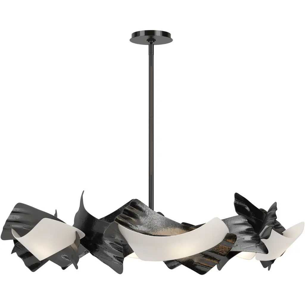 Designer Jason Hancock was inspired by the rolling waves of the sea, easily seen in the Crest Circular Pendant that embodies that essence of both strength and grace. Its hammered steel pattern, curved plates and art glass create a sense of ebb and flow with six lights illuminating the space.
