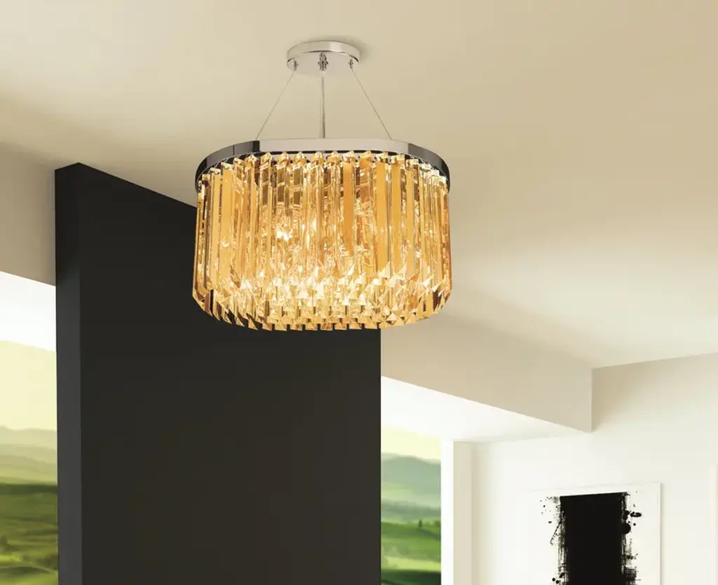Light source: 6 x E14 (US E12) / 8 x G9 halogen energy server - 6 x E14 (US E12) / 8 x G9 LED bulbs.Enclosed in mysterious geometrical structures, imagination is at last set free to express itself through a ray of sun. Cristalli by Patrizia Volpato is an exciting challenge in which these creations seek an indissoluble link between the reign of magic and our spirit. The light is split to give life to a myriad of forms which offer precious breaths of energy.Available finishes: Polished chrome, shiny 24 carat gold. Available glass colors: Transparent V1, Aquamarine V9, Red V7, Amber V6, Pink V3, Smoke V10, Bronze V11.
