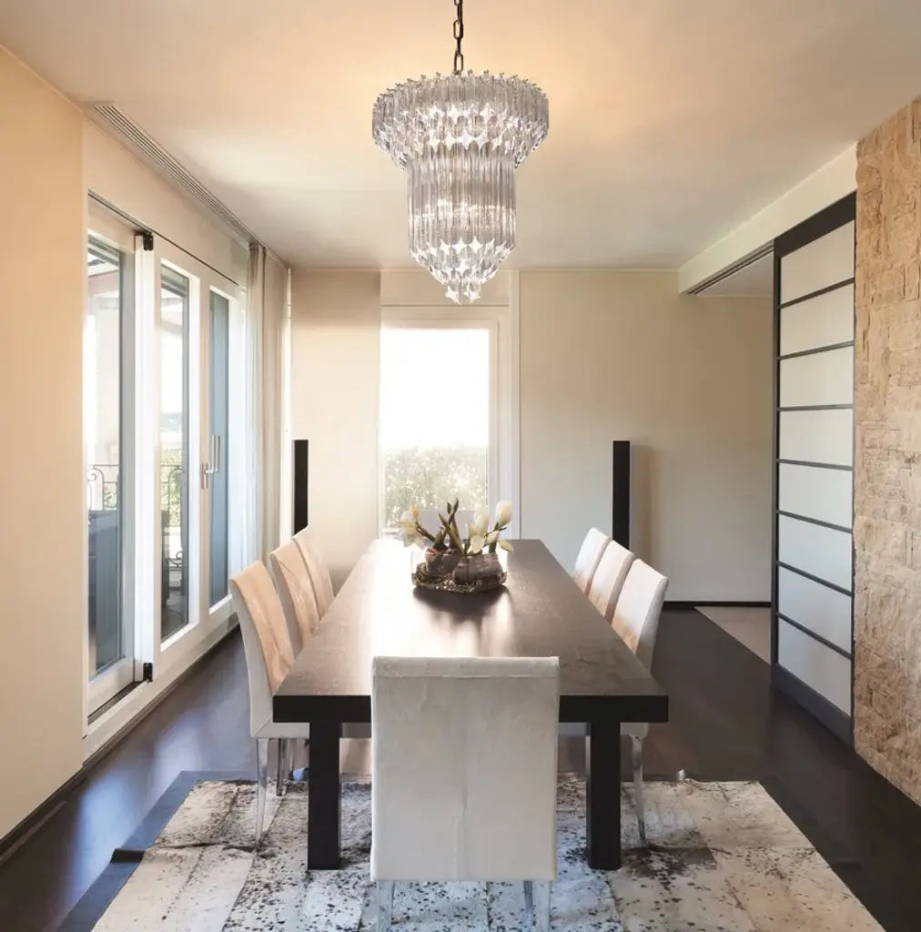 Light source:10 x E27 (US E26) halogen energy server - 10 x E27 (US E26) LED bulbs.Enclosed in mysterious geometrical structures, imagination is at last set free to express itself through a ray of sun. Cristalli by Patrizia Volpato is an exciting challenge in which these creations seek an indissoluble link between the reign of magic and our spirit. The light is split to give life to a myriad of forms which offer precious breaths of energy.Available finishes: Polished chrome, shiny 24 carat gold. Available glass colors: Transparent V1, Aquamarine V9, Red V7, Amber V6, Pink V3, Smoke V10, Bronze V11.