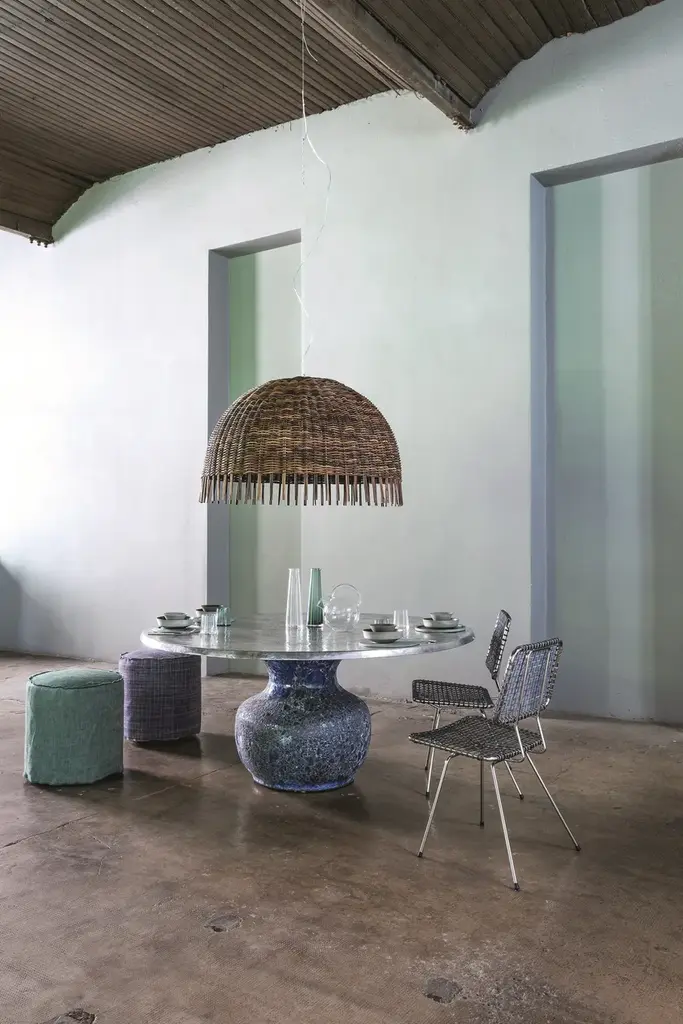 Croco 95 is a suspension lamp in crocodile rattan, handwoven, max. power 20 W, 220 Volt, bulb holder E 27, bulb not included (electrical cable lenght 200 cm; steel cable lenght 200 cm).Of exotic inspiration, the Croco pendant lamp collection takes its name from the material used for the weaving, which in the indigenous language of the Indonesian province of Kalimantan is translated as crocodile, thanks to its particular dark colour. Proposals with a natural flavour that create a soft light bringing with it a feeling of warmth.