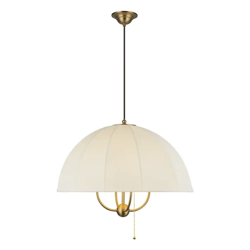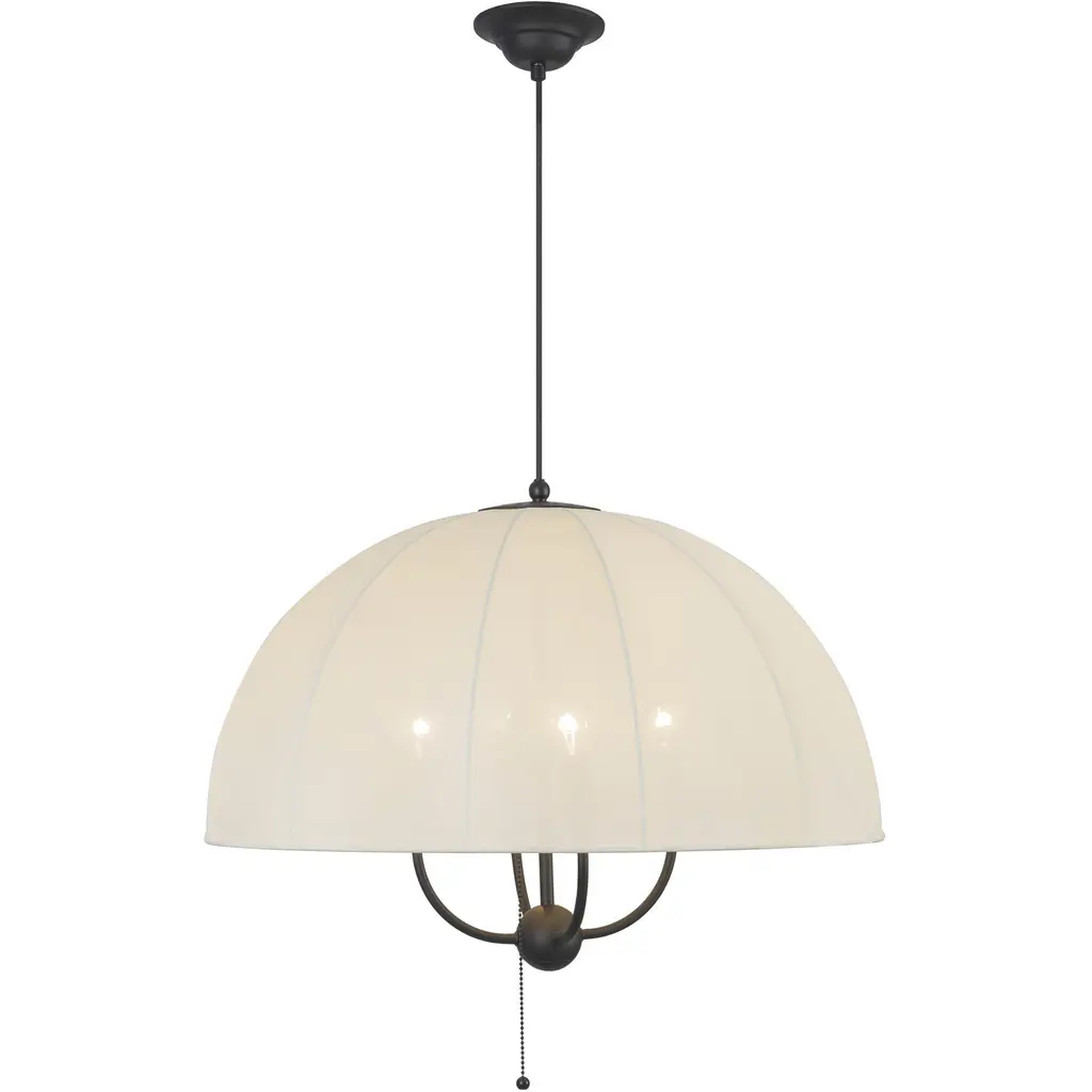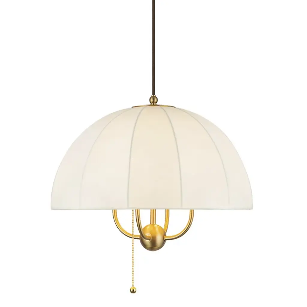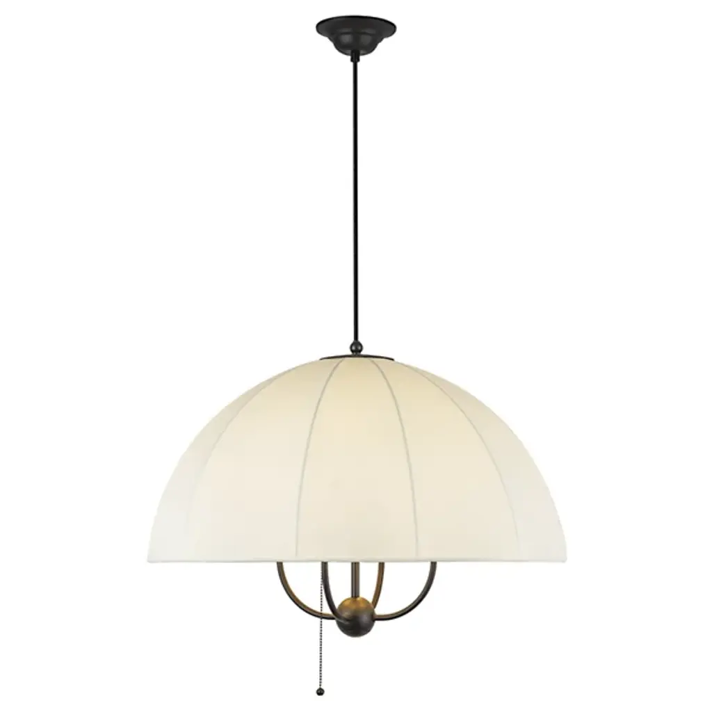 The Crosby Pendant from Alora Mood floats overhead like an umbrella of light, softly diffusing a warm glow through its natural fabric dome shade. Designed by Kelsey Leigh, this transitional fixture features a slim cable suspension system inspired by traditional parasols that lends a weightless feel to its gently layered form. Short, slender steel arms add structure inside the shade, while a chain pull switch adds a subtle vintage detail. The design balances nostalgic inspiration with modern simplicity, casting a generous glow and bringing charm and atmosphere to any open living space.
