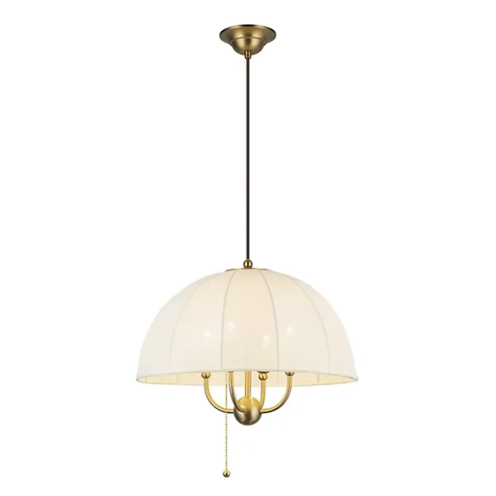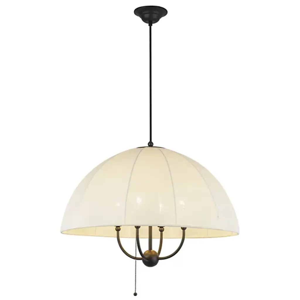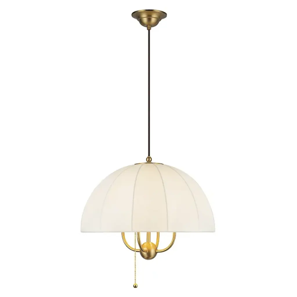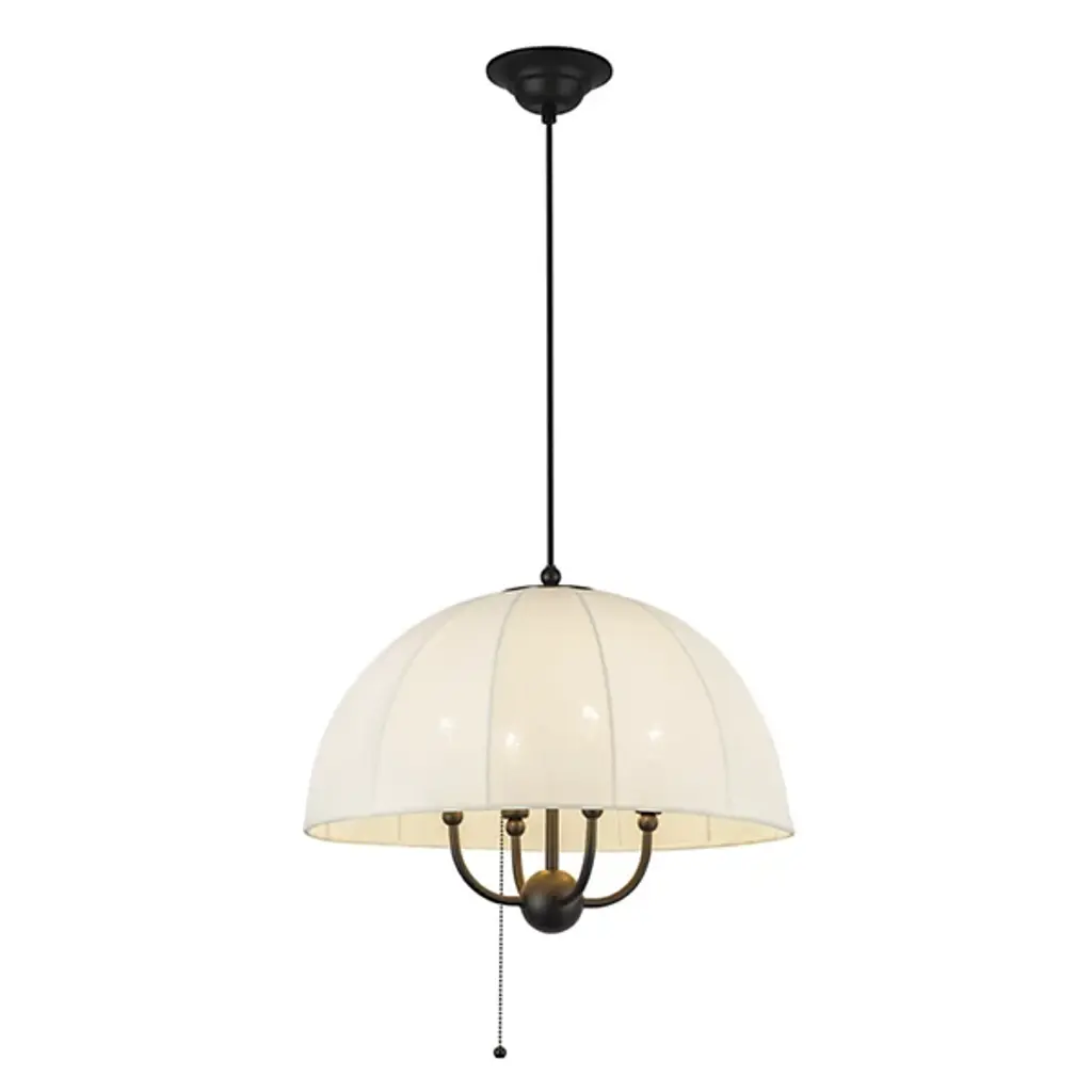 The Crosby Pendant from Alora Mood floats overhead like an umbrella of light, softly diffusing a warm glow through its natural fabric dome shade. Designed by Kelsey Leigh, this transitional fixture features a slim cable suspension system inspired by traditional parasols that lends a weightless feel to its gently layered form. Short, slender steel arms add structure inside the shade, while a chain pull switch adds a subtle vintage detail. The design balances nostalgic inspiration with modern simplicity, casting a generous glow and bringing charm and atmosphere to any open living space.