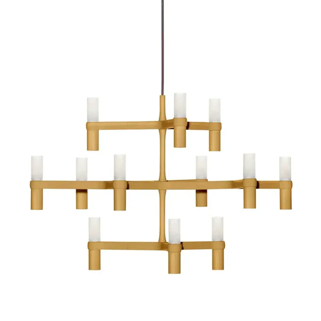 Pendant chandeliers designed by Jehs + Laub, with a modular structure in die-casted aluminum and sandblasted glass diffusers. Structure in hand polished aluminum, glossy gold plated, black plated, or painted in matte white, matte black or gold. Widespread light. Shipped with transparent cable. Features