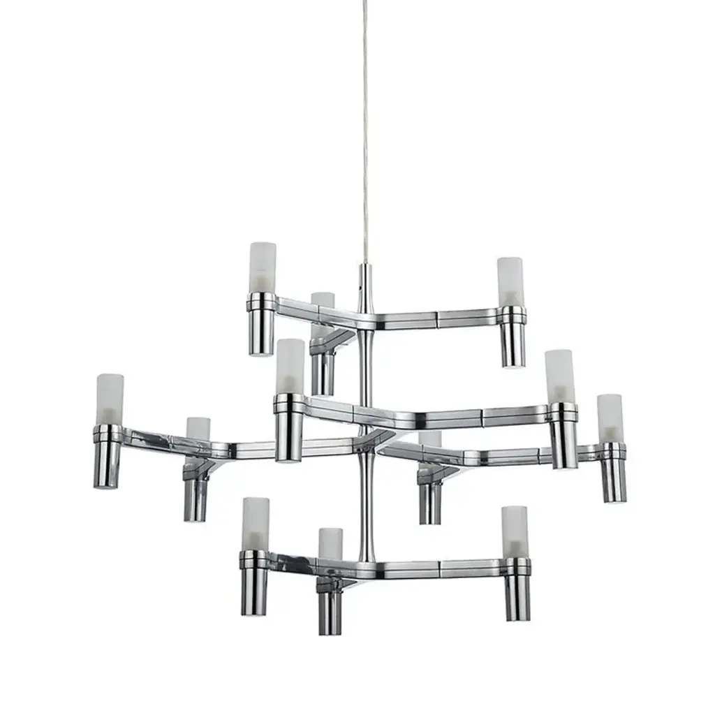 Pendant chandeliers designed by Jehs + Laub, with a modular structure in die-casted aluminum and sandblasted glass diffusers. Structure in hand polished aluminum, glossy gold plated, black plated, or painted in matte white, matte black or gold. Widespread light. Shipped with transparent cable. Features