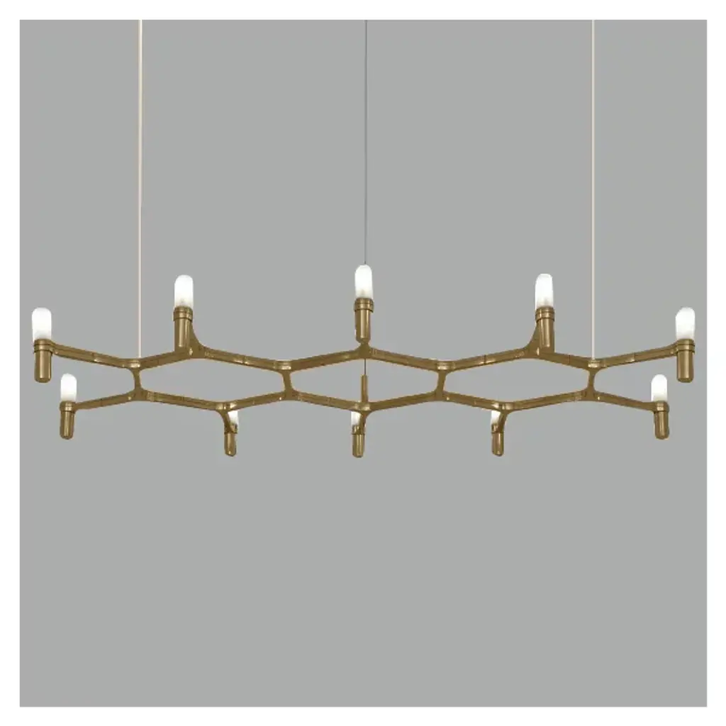 CROWN PLANA is an aluminium chandelier. Structure is available in different versions hand polished aluminium, glossy gold plated or black plated, painted in matt white, matt black, or matt gold. Widespread light.Available a NEMO LED G9 kitLED/HALOSource halopin G9 QT-14Total power 10x25WEmission diffusedSwitching dimmable, according to bulbTension 110/230VFamily composed by pendant chandeliers whose shape is inspired by the outline of the snow crystal. Modular lamps realized with a die-casted aluminium structure and sandblasted glass diffusers. Double switch for the Summa and Magnum versions. The pendant versions are equipped with transparent cable.Available a NEMO LED G9 kit