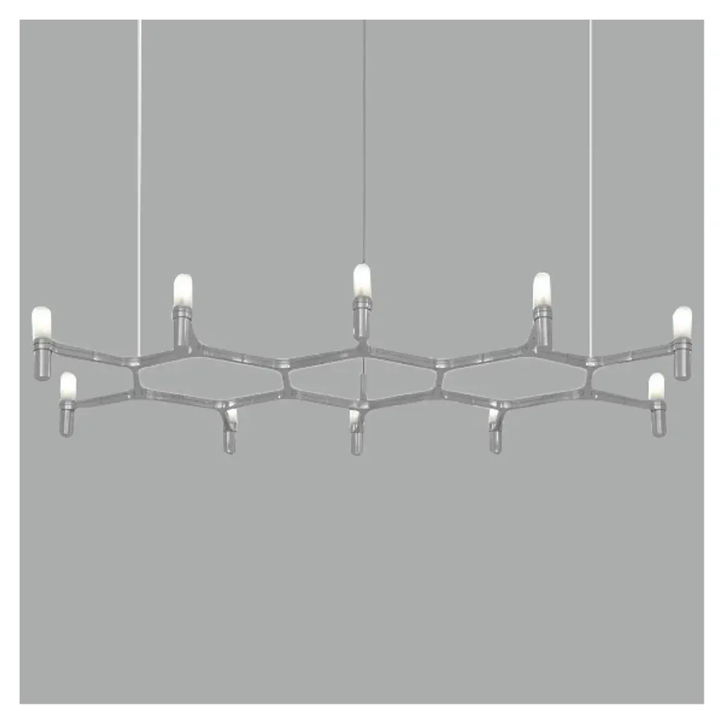 The Nemo Crown Plana Suspension fits three hexagonal modules together like a cross section of a beehive, emitting a perimeter of soft diffused light through 10 light sources. The linear suspension compresses the look of a tiered chandelier, using a strong aluminum frame with minimal ornamentation. Sandblasted glass diffusers replace dim candle light with widespread illumination, evenly spreading light across long dining areas or rooms with slender proportions.