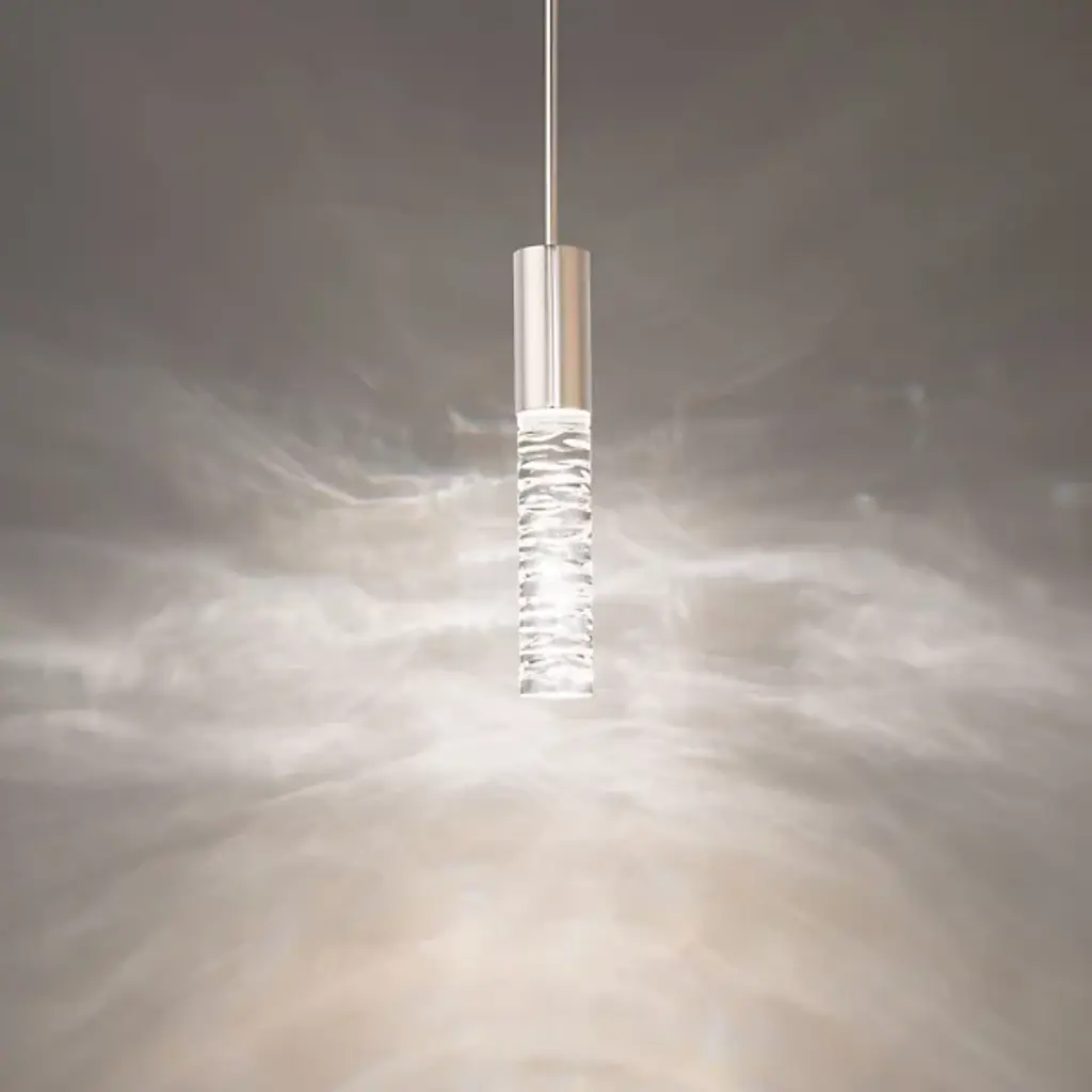Bring glittering glamor to your inside spaces with the Cru LED Mini Pendant from Schonbek Beyond. A clever contemporary design fashioned from smooth aluminum and descending from a stepped canopy via a slender downrod, it seats strong and damp-rated LED lamping inside a small cylindrical housing below. A similar-diameter diffuser shade fashioned from clear optic crystal extends down from the lamping, blunting bright glare into a sparkling ambiance that reflects off the metalwork above it.