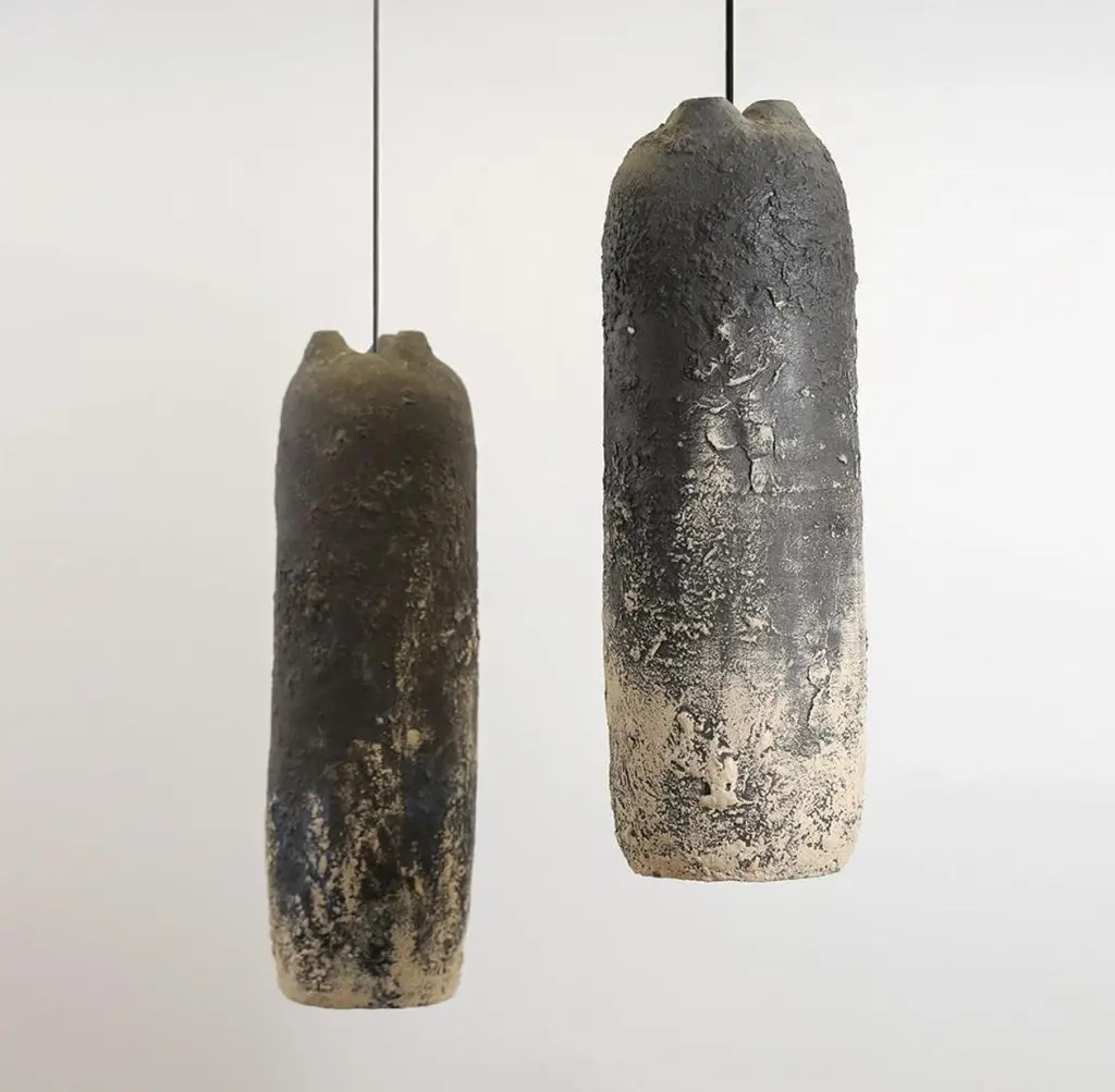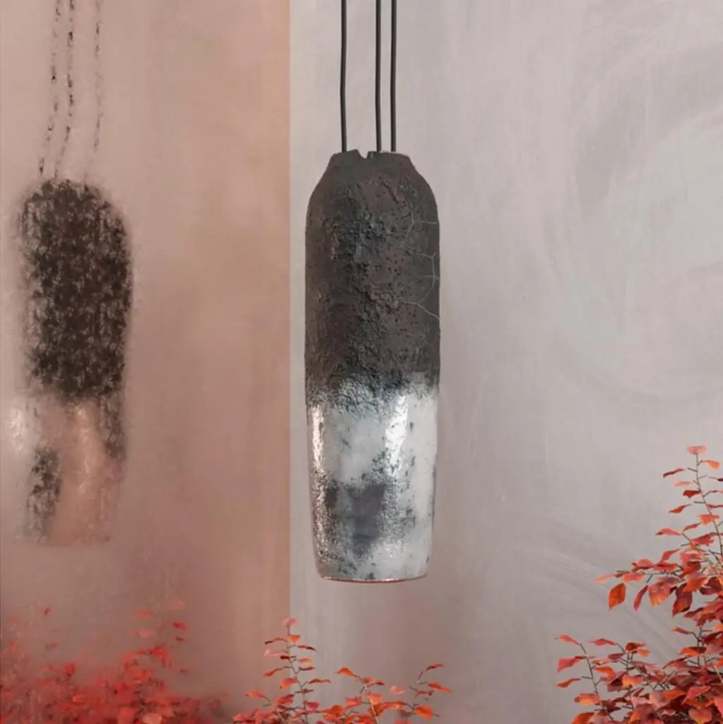 Crust thin pendant lamp by MakhnoDimensions: W 21.5 x D 21.5 x H 68.5cm Materials: ceramicsThe three Crust brothers crack in art. The unique perennial burning technique gives birth to deep textured authors cracks. You never know how nature will behave this time. They share the same materials and color array. Yet, they are different inside. Thin is the oldest Crust brother with a passionate copper inside. It is a high-browed snow mountain coated in the iron sky.Makhno Studio is a workshop of modern Ukrainian design and architecture. We work in Ukrainian contemporary style. According to international experts, this style will change the Scandinavian on the world design stage.Since 2003, we have been creating projects intertwining Ukrainian traditions, world trends and the Japanese philosophy of wabi-sabi, the forces of nature, human talent and architectural mind. We have completed over 600 projects in 21 countries and are ready to create something significant for you.The main task of our specialists — architects, designers, ceramists — is to create comfort that will become near and dear.All our lamps can be wired according to each country. If sold to the USA it will be wired for the USA for instance.