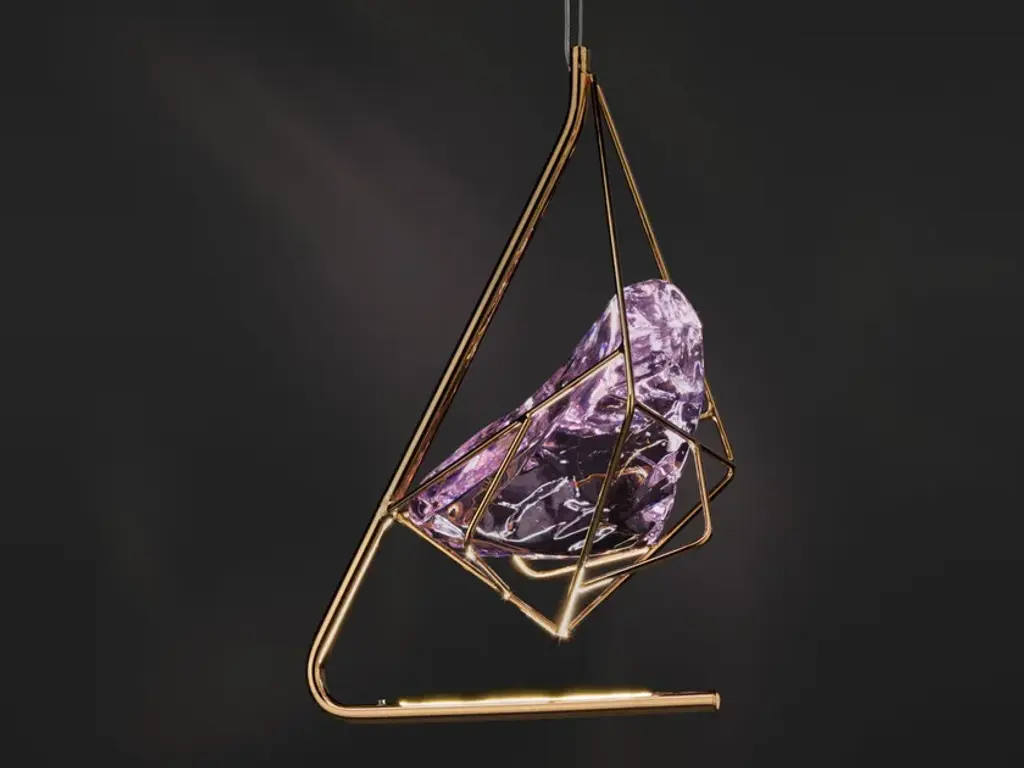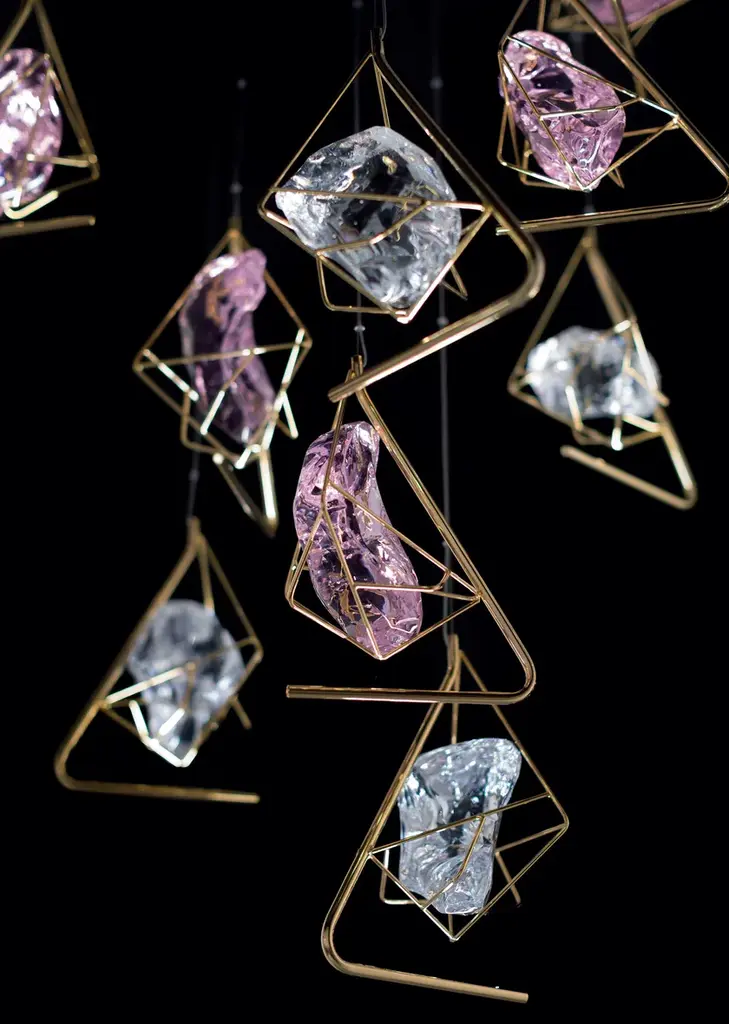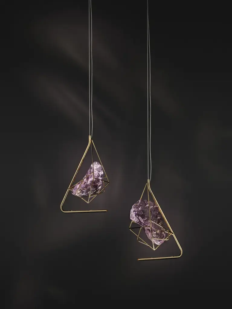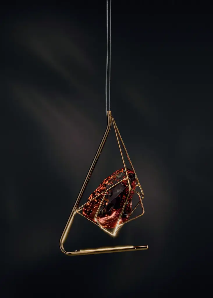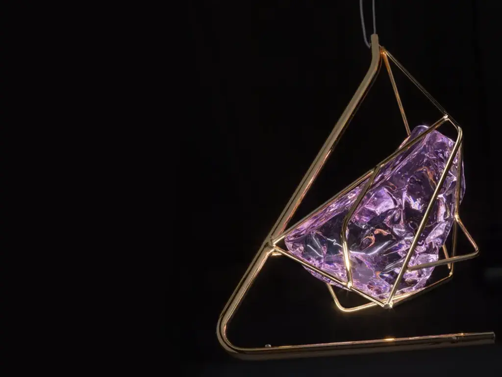 CRYROCK is an Euroluce Light of Italy idea that in occasion of I Saloni del Mobile ( Milan – April ’19 ) presented its new brand called TXXNTY BRAND DESIGN.The crystal, made in Tuscany, is slightly worked with the aim to convey its forms free as found in nature. This of course make each CRYROCK an unique piece. To valorize the crystal, it has been studied by Euroluce Light of Italy designers a metal cage with silver welds that thanks to the led filament set on the base, it exalts the beauty and naturalness. Available in 2 models: - CRYROCK S11 tinylight 2W - 3500°K - 24 Vdc - 300 lm- CRYROCK S1212 tinylight 24W - 3500°K - 24 Vdc - 3600 lm Finish | shiny gold. Other finishes on request.Color | rosaline gleam, transparent, topaz, viridian. Other colors on request.Details | Cryrock is a patented collection. Crystal rock made in Tuscany. The rock is worked in order to smooth the edges off and to round its shape. It does not undergo any grinding work and this allows a unique result that can’t be reproduced in series. The metal structure is handcrafted on our drawing with silver welds. The Led filament illuminates and highlights the crystal. The suspension S12 is an example: it’s possible to request different configurations, shapes and number of elements.
