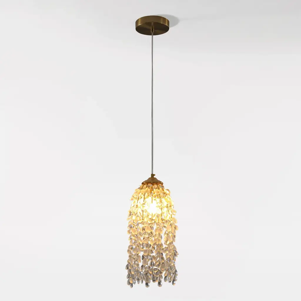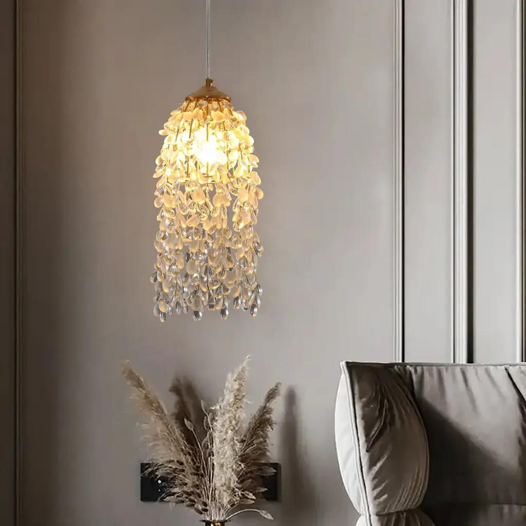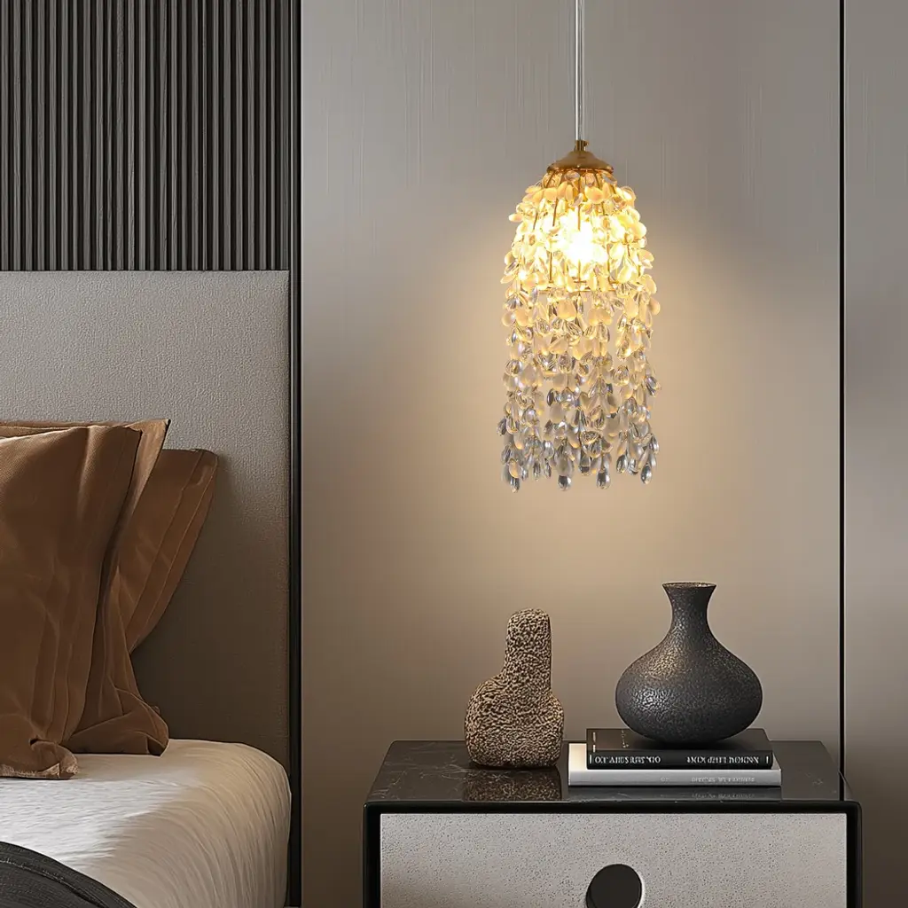 Add a touch of elegance to your space with this crystal pendant light. Featuring cascading crystal droplets and a sturdy iron frame, it creates a warm, inviting glow perfect for bedrooms, dining rooms, or entryways. The refined design enhances any modern or classic decor style.