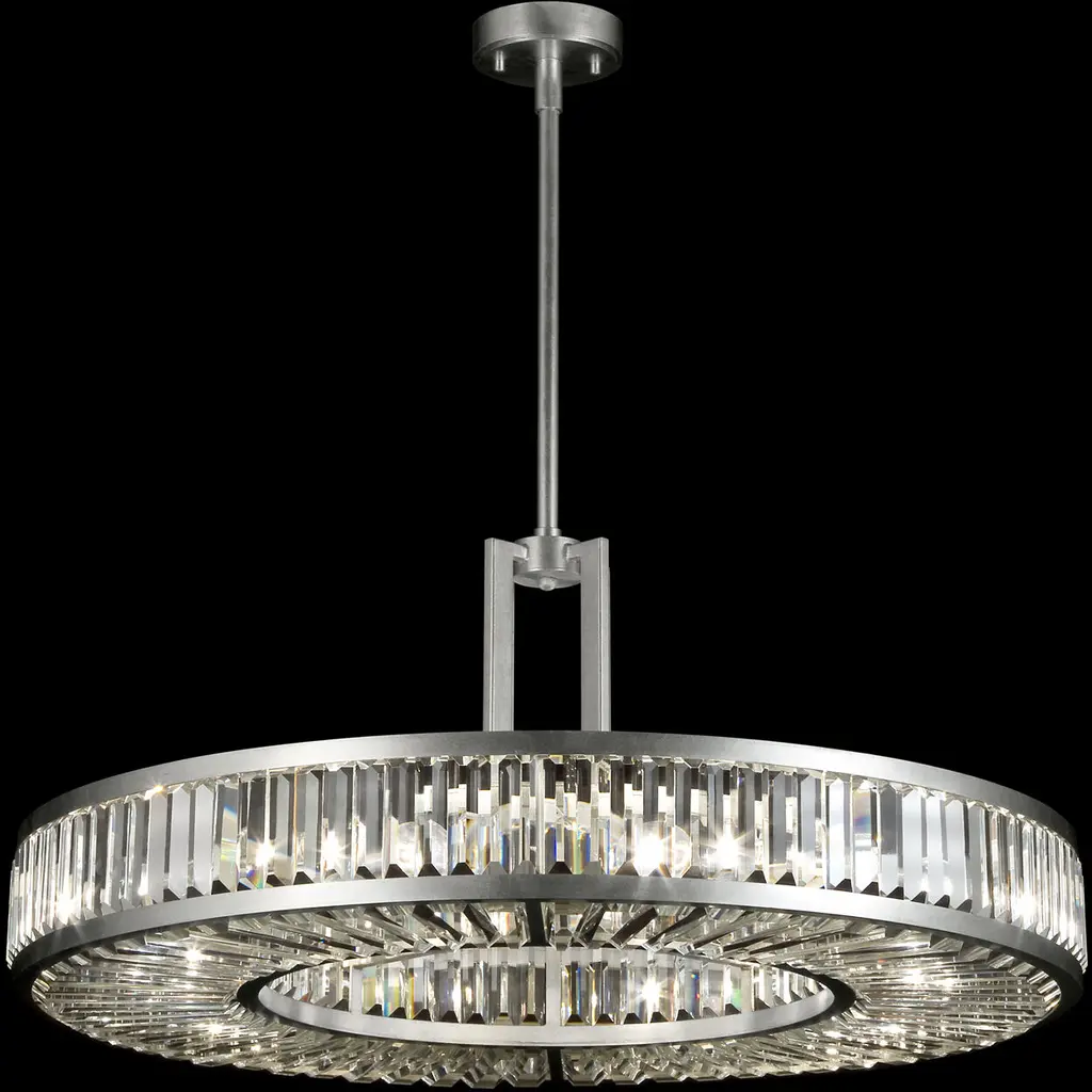 Chandelier in a modern design of multi-faceted crystal panels, set in gold leaf metal frames that refract light and create an enchanting aura highlighting appointments and transforming a space with extraordinary effect. Also available in silver leaf.