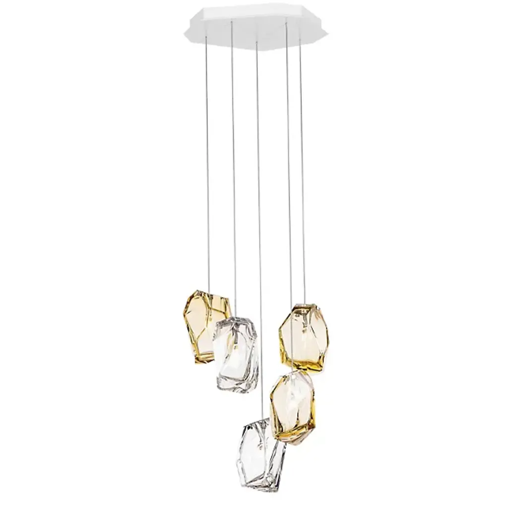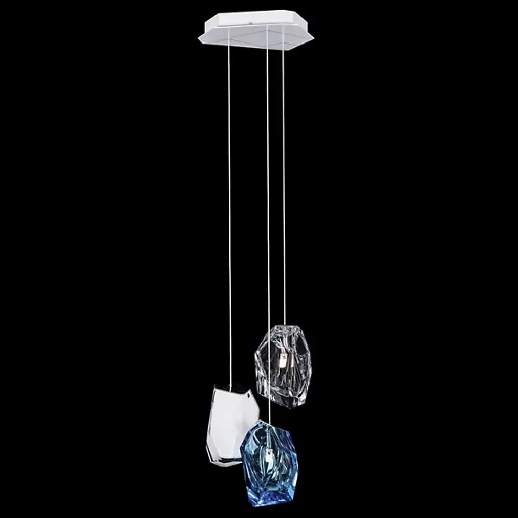 The Crystal Rock Multi-Light Pendant from Lasvit adds glittering artistry to inside spaces. An Arik Levy design drawing on his multifaceted experience as a designer, artist, technician, filmmaker, and more, this piece presents the same multifaceted character. Starting with a stepped, abstract canopy that echoes its surroundings, it extends thin cables to LED lamping set within smoothly-polished, abstractly-cut shades of crystal glass for a smooth, sci-fi flair that gives a glittering performance.