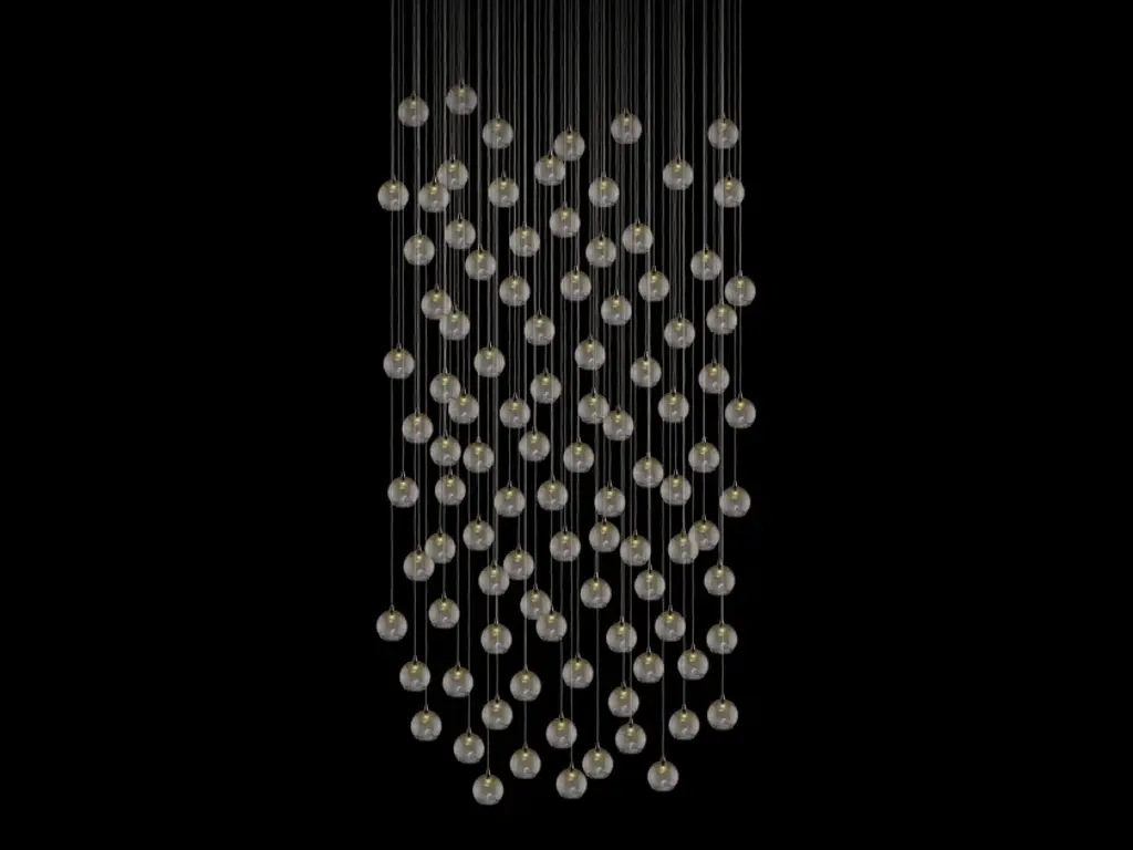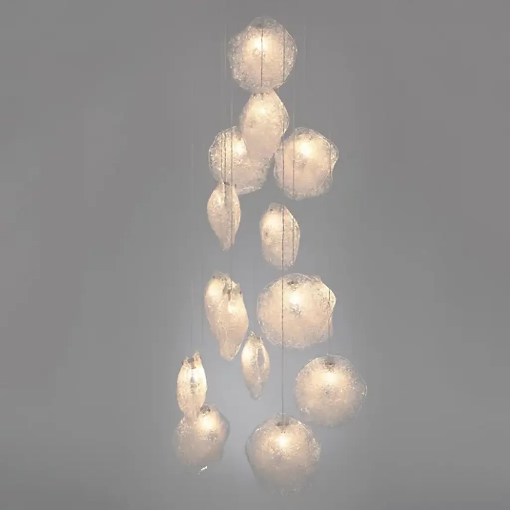 The Crystal Shell 18 Multi-Light Pendant from Shakuff blurs the lines between art and design as a dazzling piece inspired by memories of the sea. Shakuff's pieces seek to illustrate the natural beauty of light. Glass artisans reveal light with handblown and handcrafted forms. Two pieces of glass joint together like a luminous clamshell. Icy glass applied to the surface of the shell creates a rich texture that softens the image of the lamp. The piece hangs gracefully in the air with fine cord and elegant metal hardware. When turned on, the shells produce a double-sided display of fantastic highlights. Light scattering through the glass reaches one's eyes as a soft, radiant glow.