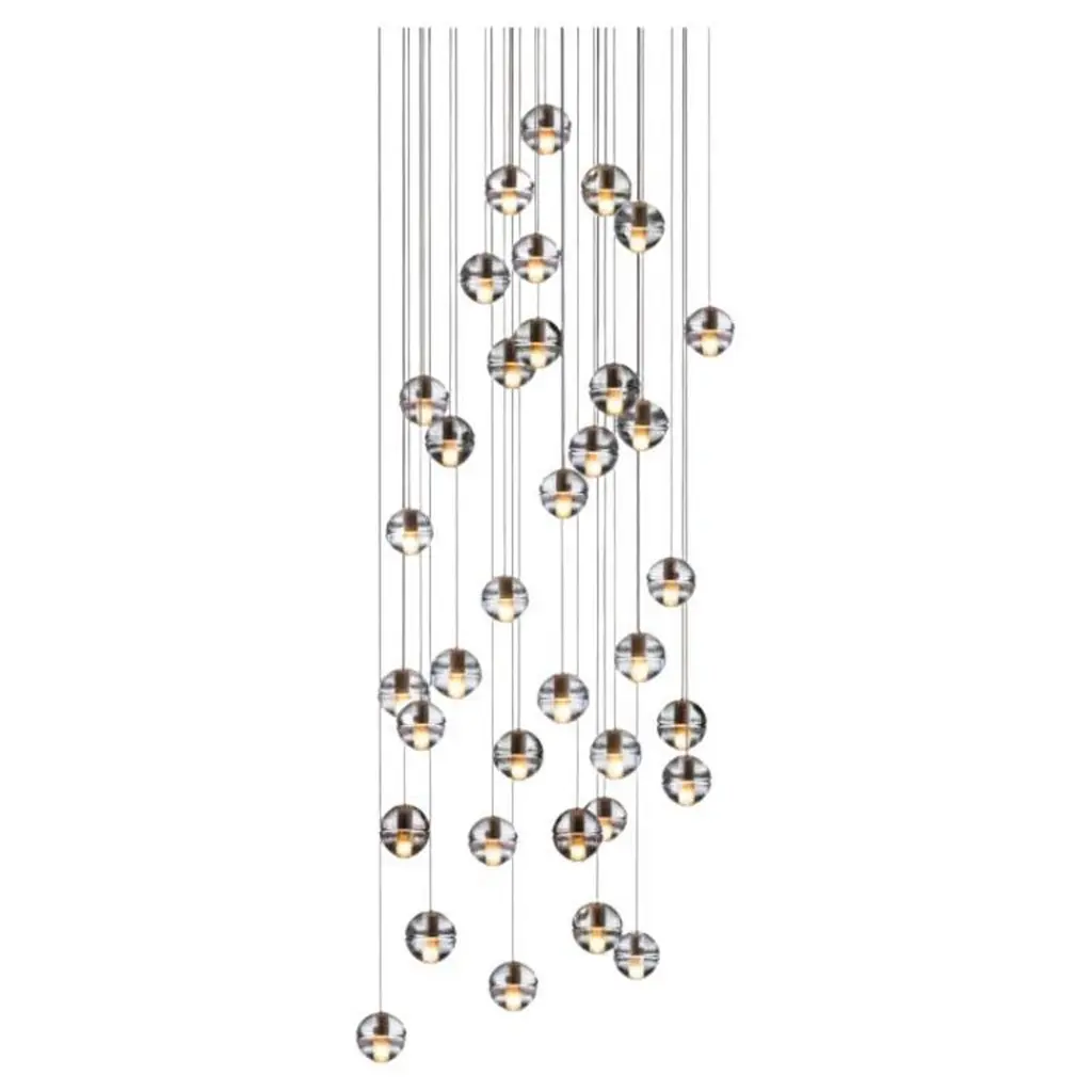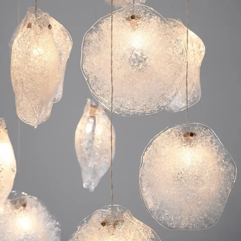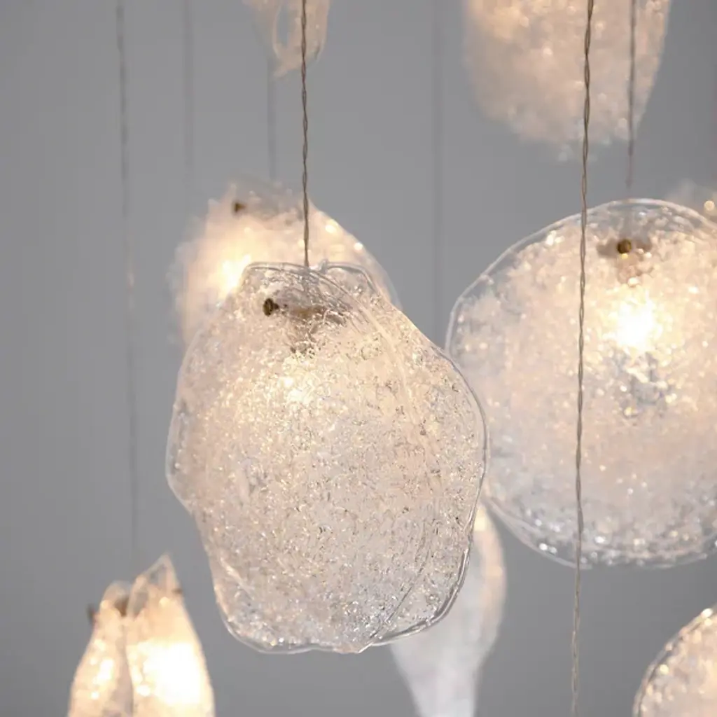 The Crystal Shell 18 Multi-Light Pendant from Shakuff blurs the lines between art and design as a dazzling piece inspired by memories of the sea. Shakuff's pieces seek to illustrate the natural beauty of light. Glass artisans reveal light with handblown and handcrafted forms. Two pieces of glass joint together like a luminous clamshell. Icy glass applied to the surface of the shell creates a rich texture that softens the image of the lamp. The piece hangs gracefully in the air with fine cord and elegant metal hardware. When turned on, the shells produce a double-sided display of fantastic highlights. Light scattering through the glass reaches one's eyes as a soft, radiant glow.