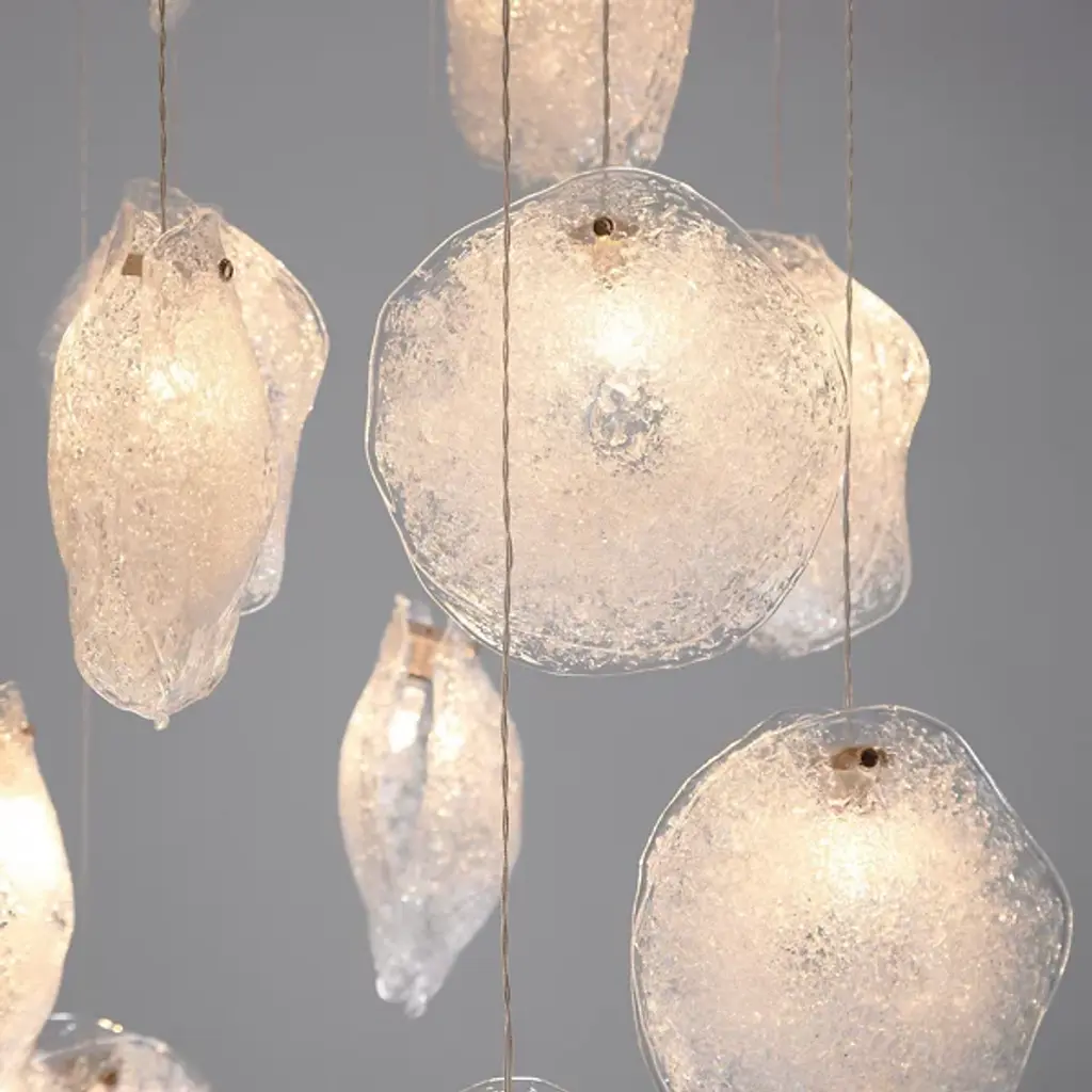 The Crystal Shell LED Multi-Light Pendant by Shakuff lends its environments a signature natural style. A broad stepped-rectangle ceiling mount in robust metal secures the fixture, dispatching an evenly spaced array of height-variant LED lamps downward. Each lamp is accompanied by an encompassing shade of handmade glass in a clamshell shape featuring wavy ends and small pieces of fused glass in different patterns that swap bright glare for a warm glow and evoke the natural world, showcasing the inspiration of founder Joseph Sidof’s childhood visits to the Northern Israeli shore.