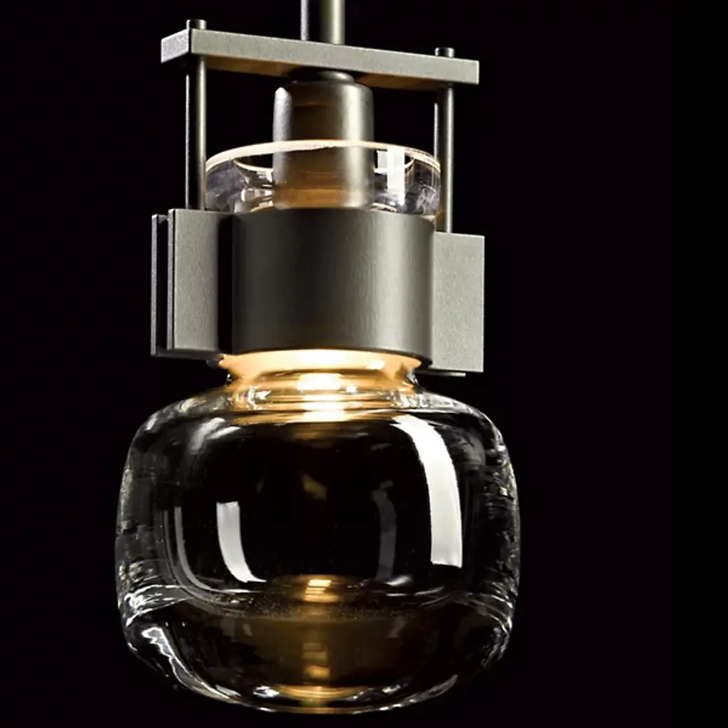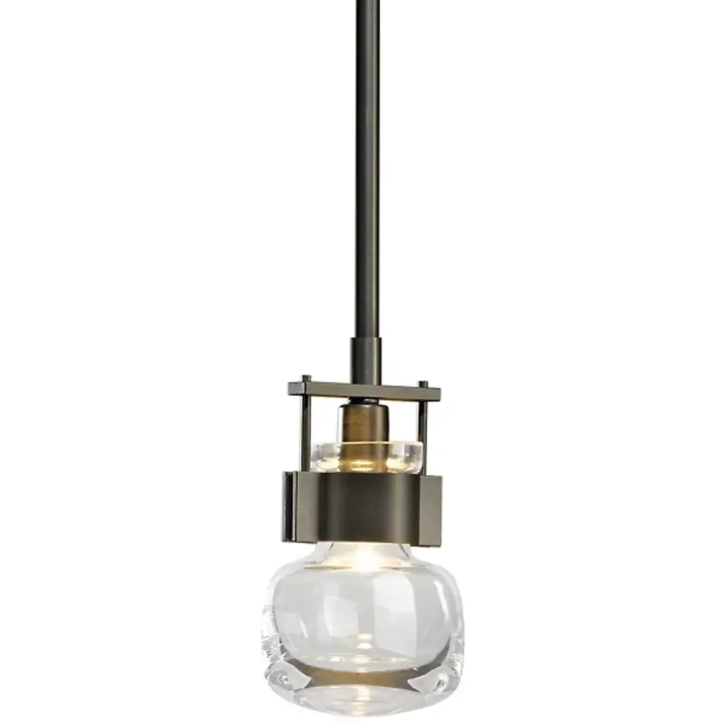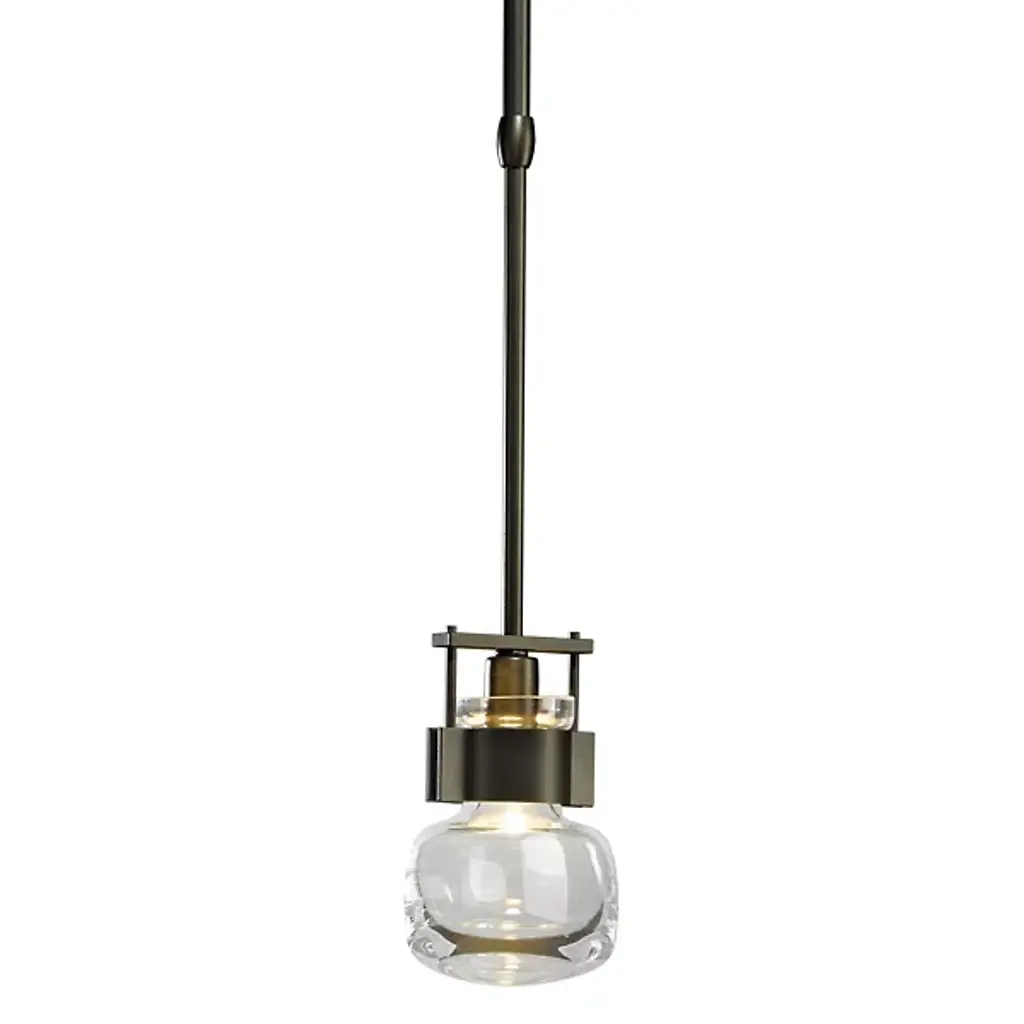 An ultra-clean design with bold industrial touches. The Cuff Mini Pendant by Hubbardton Forge is a combination of graceful thick blown glass and hand-forged wrought iron that create an eye-catching contrast and works in a range of décors, from modern to transitional. The flask-shaped body is held to the adjustable stem and round canopy with the help of a bold cuff detail. When lit, the halogen bulb within the shade diffuses through the thick glass to cast a soft, ambient glow, creating a stunning lighting experience.