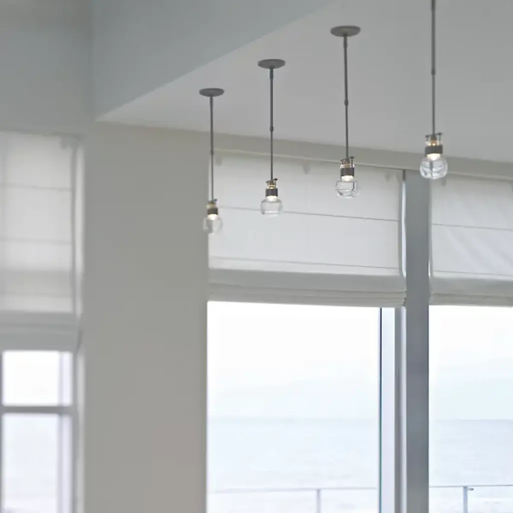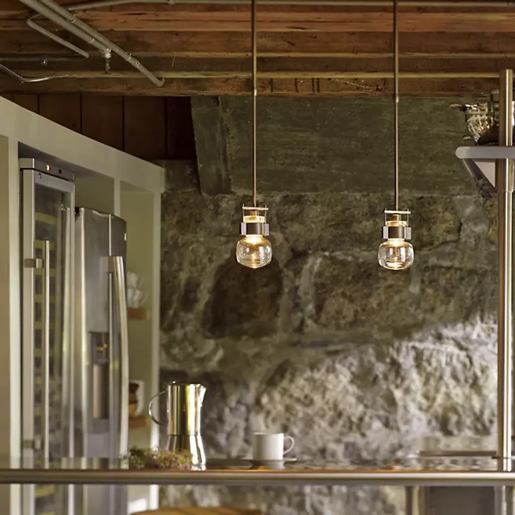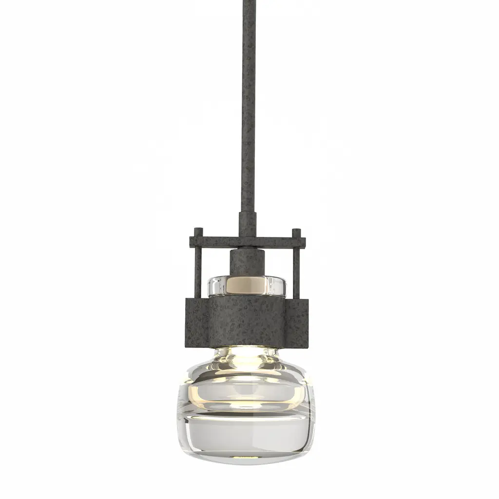 An ultra-clean design with bold industrial touches. The Cuff Mini Pendant by Hubbardton Forge is a combination of graceful thick blown glass and hand-forged wrought iron that create an eye-catching contrast and works in a range of décors, from modern to transitional. The flask-shaped body is held to the adjustable stem and round canopy with the help of a bold cuff detail. When lit, the halogen bulb within the shade diffuses through the thick glass to cast a soft, ambient glow, creating a stunning lighting experience.