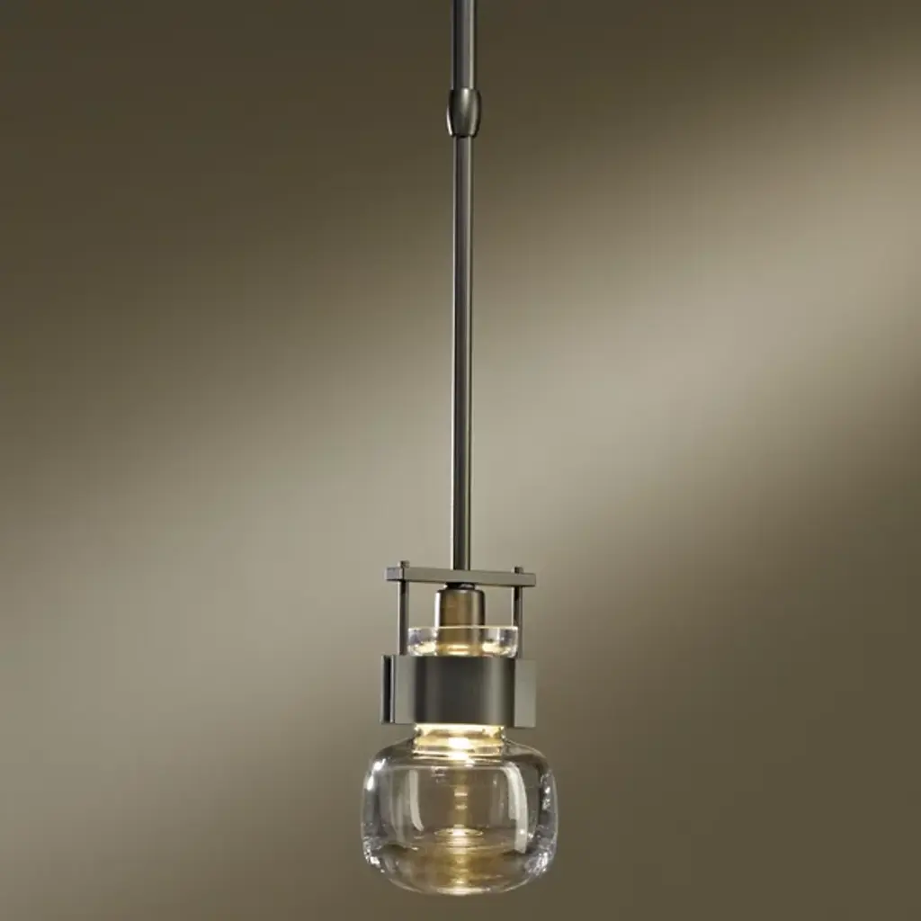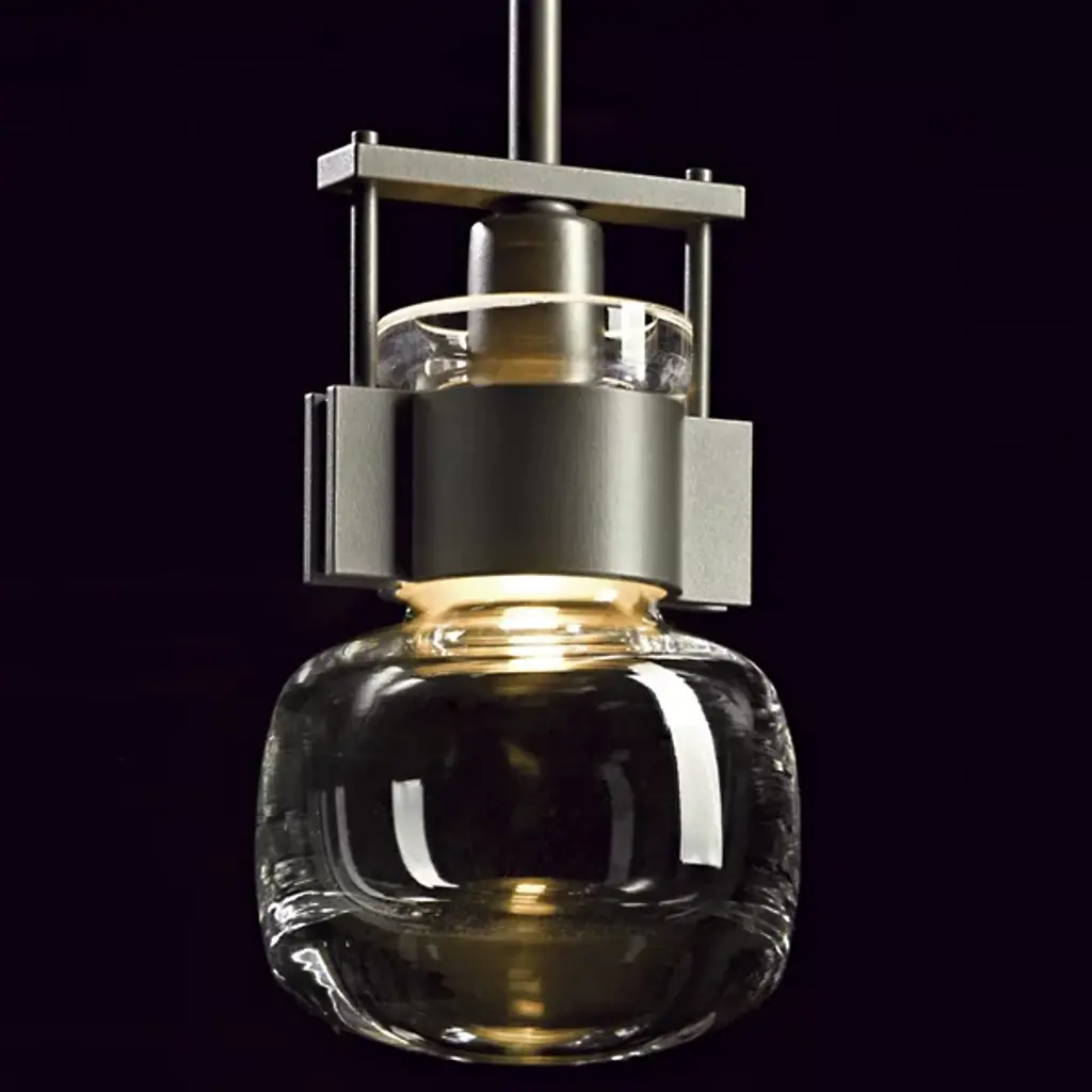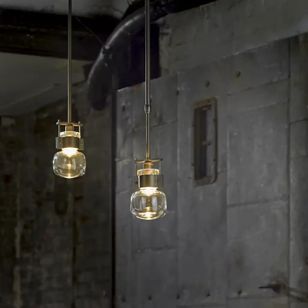 An ultra-clean design with bold industrial touches. The Cuff Mini Pendant by Hubbardton Forge is a combination of graceful thick blown glass and hand-forged wrought iron that create an eye-catching contrast and works in a range of décors, from modern to transitional. The flask-shaped body is held to the adjustable stem and round canopy with the help of a bold cuff detail. When lit, the halogen bulb within the shade diffuses through the thick glass to cast a soft, ambient glow, creating a stunning lighting experience.