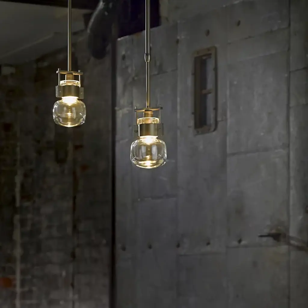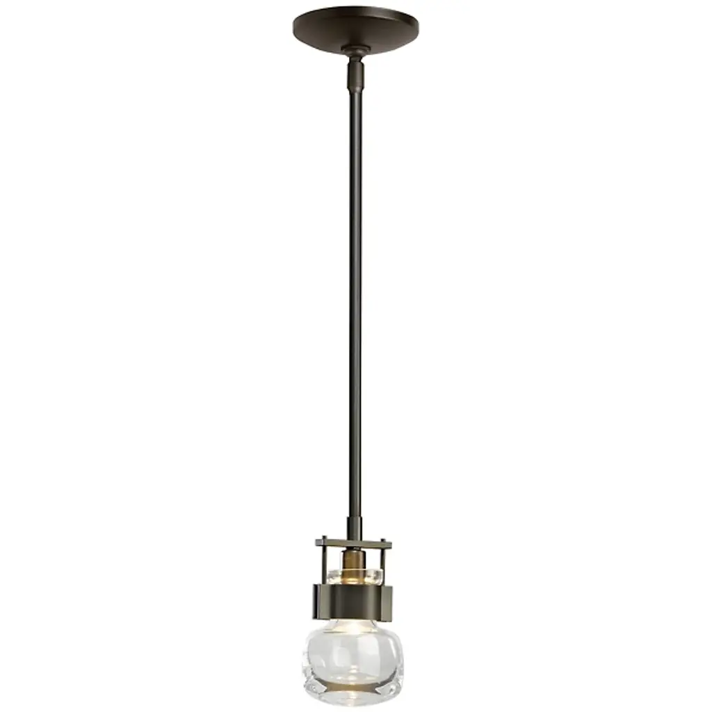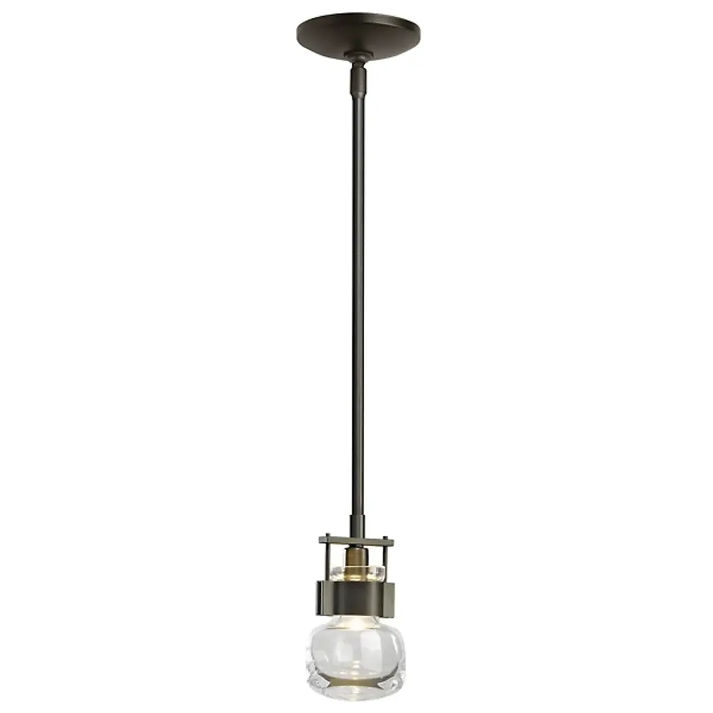 An ultra-clean design with bold industrial touches. The Cuff Mini Pendant by Hubbardton Forge is a combination of graceful thick blown glass and hand-forged wrought iron that create an eye-catching contrast and works in a range of décors, from modern to transitional. The flask-shaped body is held to the adjustable stem and round canopy with the help of a bold cuff detail. When lit, the halogen bulb within the shade diffuses through the thick glass to cast a soft, ambient glow, creating a stunning lighting experience.
