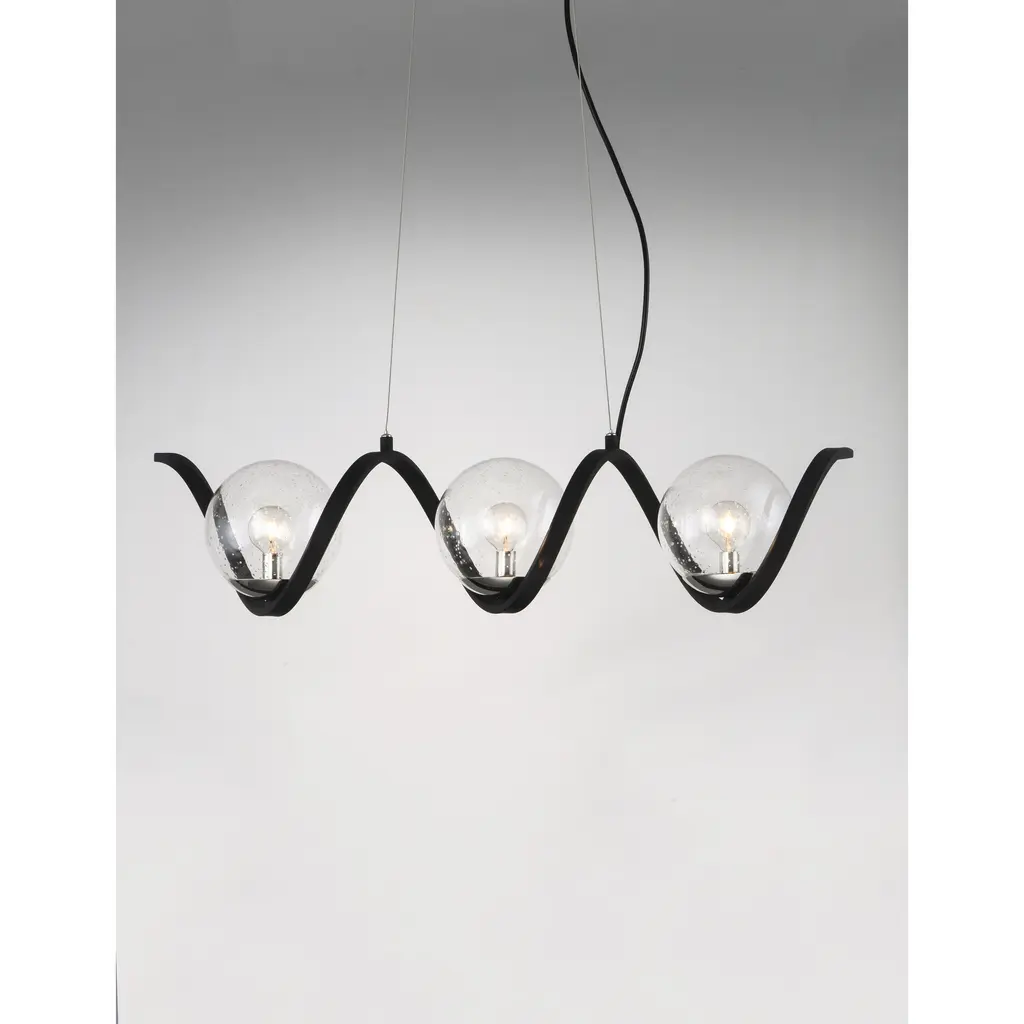 Rectangular metal channel, finished in Black, is meticulously formed in a curl design to create a unique and dramatic design. Clear Seedy glass balls supported by cups of Polished Nickel are strategically positioned to balance out the design.