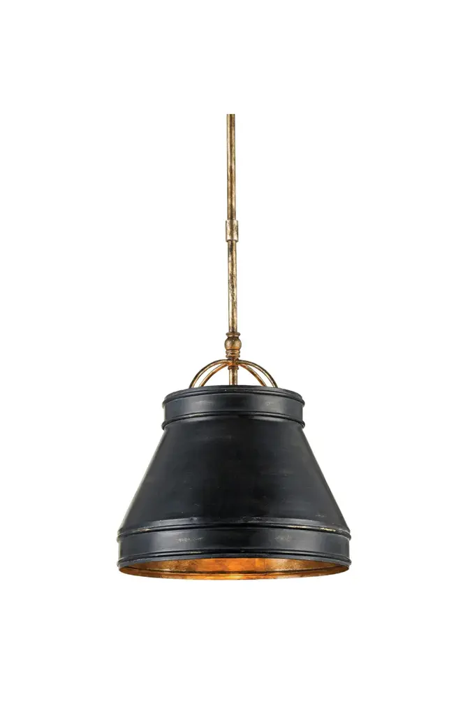 Whether you think Paris café style or the kicky New York City limelight when you see the Lumley Pendant, it will bring an urban edge to any interior. The hand-finished frame in French black is complemented by a Pyrite bronze interior, a combination that brings the warmth of the patisserie or the brazenness of the NYC bistro to mind. You’ll almost sense the aroma of baking bread and pastries wafting through the air! The petite shade is 13 inches in diameter and the stem has an adjustable hanging length. Finish: French Black/Pyrite Bronze Materials: Wrought Iron Overall: 14"h x 13"dia. Adjustable Height: 24" to 54" Weight: 6.5 lb Lights: 1 Watts per Socket/Item: 60/60 Voltage: 120v Socket: E26 Suggested Bulb: A Standard Light Direction: Downward Rods Included: 6", 12", 18" Pyrite Bronze Cord: 13' Silver Canopy: 1"h x 5.75"dia. Canopy Shape: Round Free shipping in the U.S.