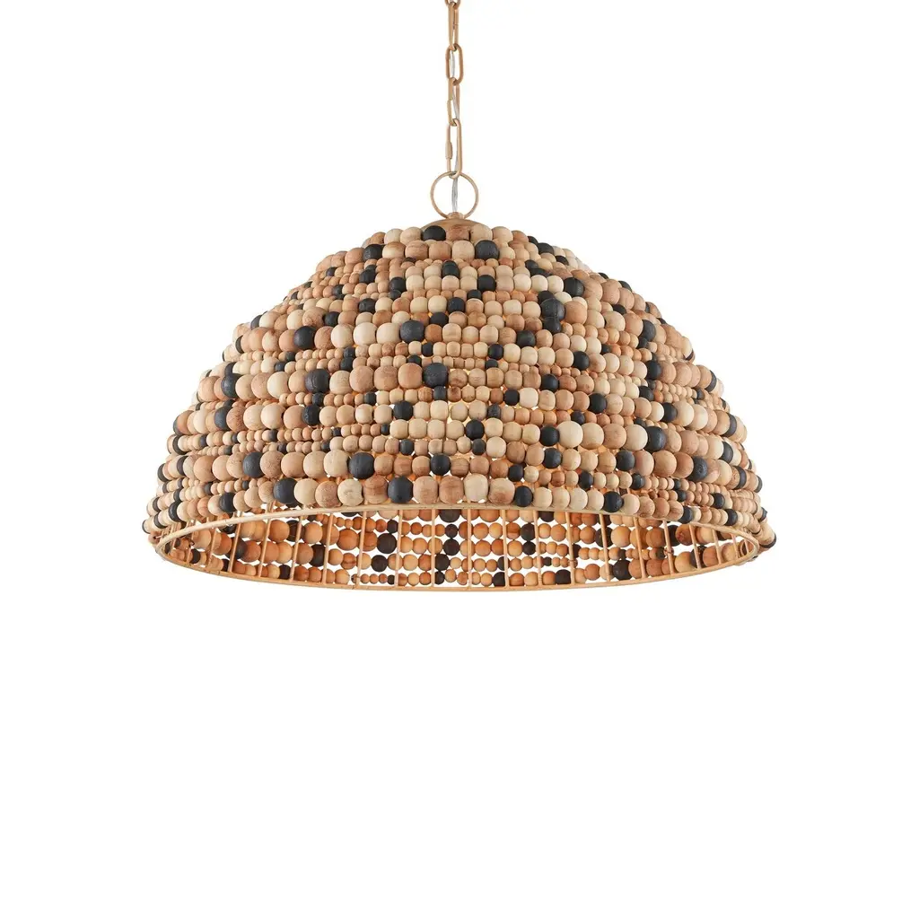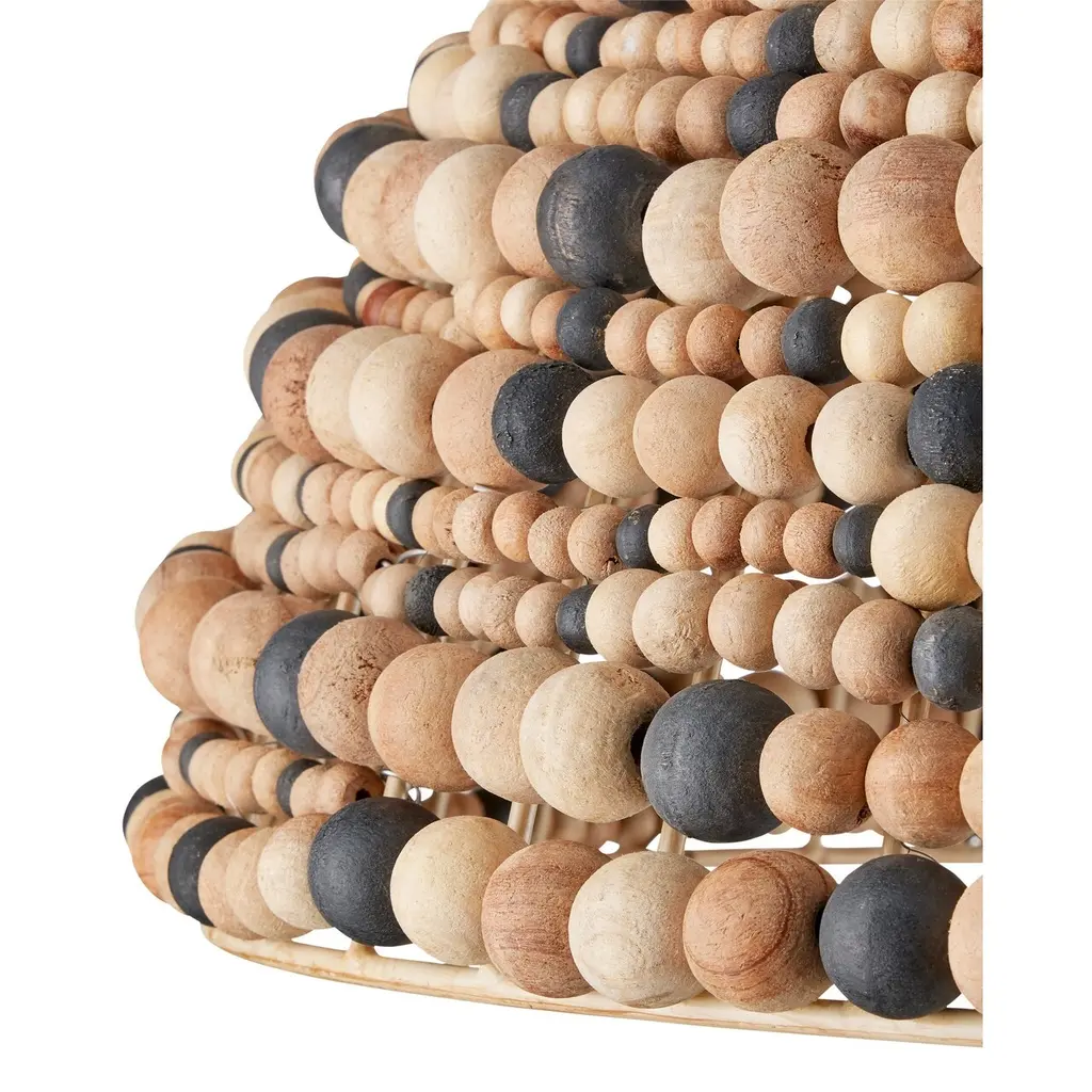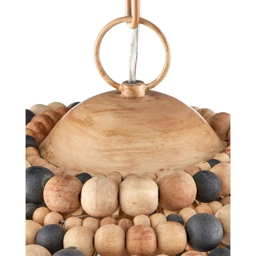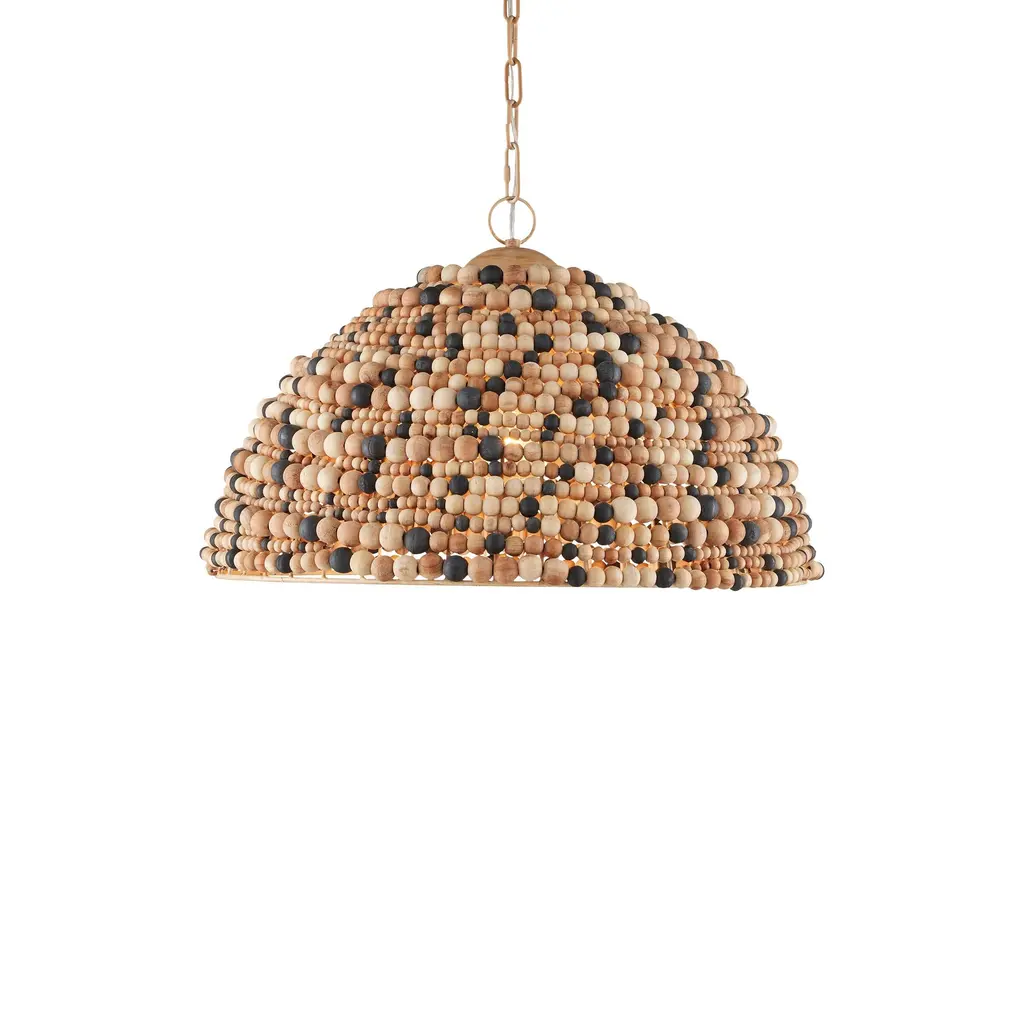 The Medley Pendant features a pebbly texture created by wood beads that vary in size and color—natural, tan, and black. The dome-shaped pendant is thoughtfully designed, with wires welded together to accommodate the different bead sizes. This striking fixture is equally captivating when viewed from underneath.