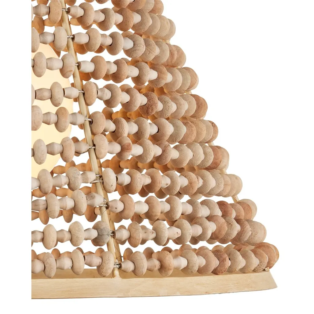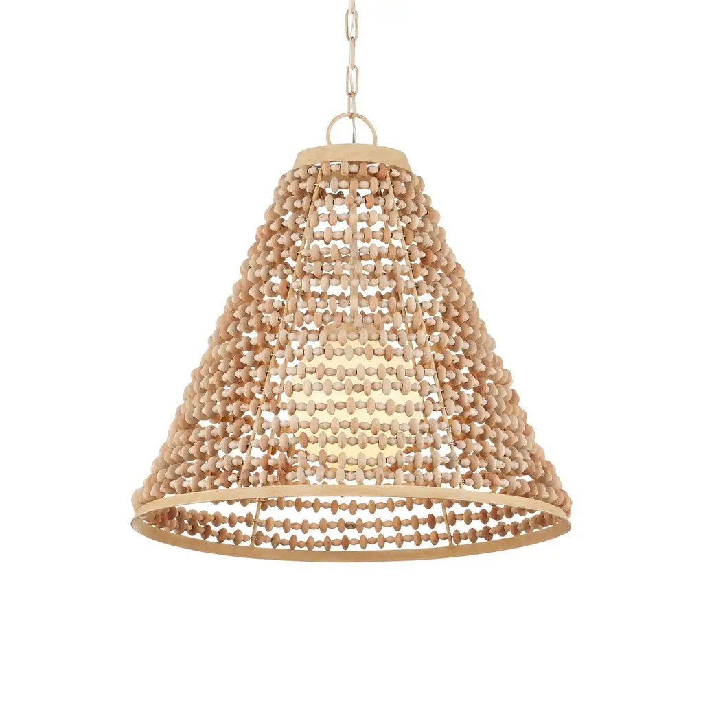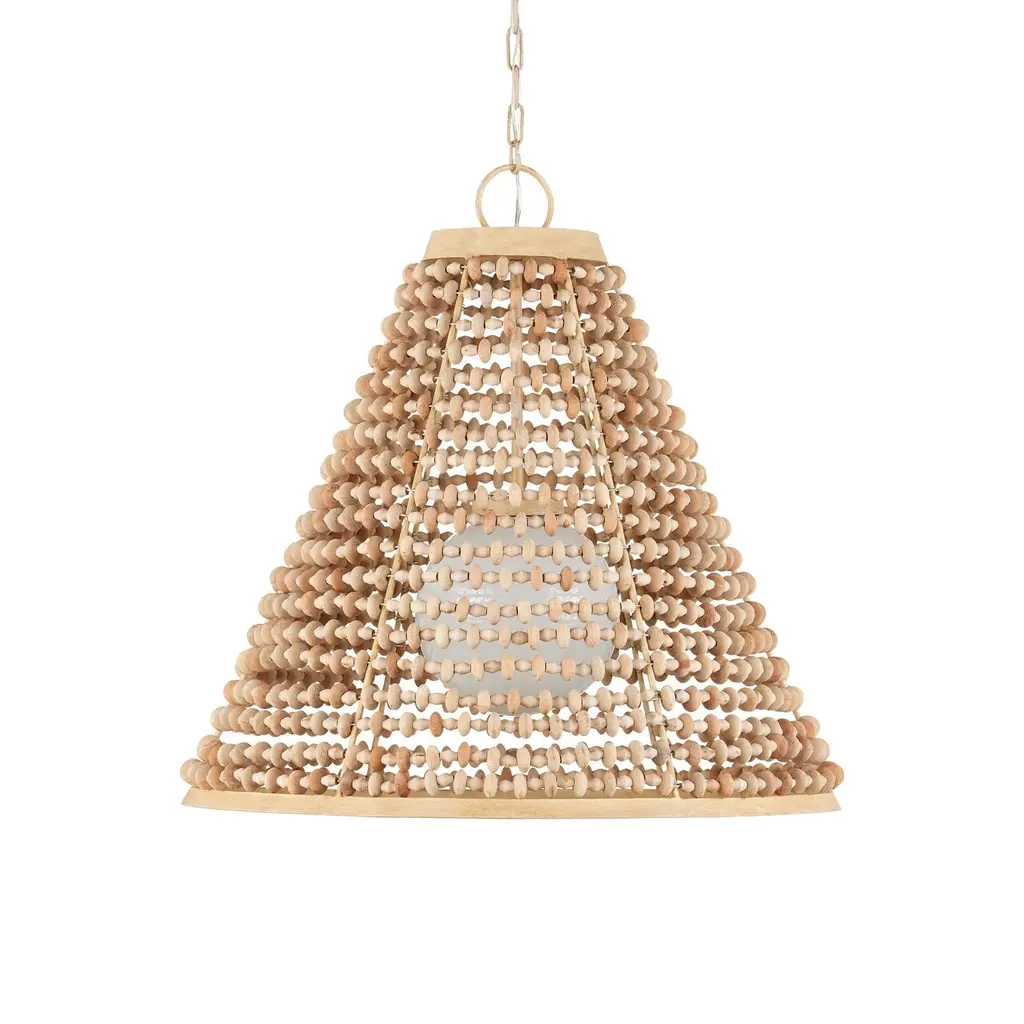 A design detail of note on the bell-shaped Pendulum Pendant are the varying sizes and shapes of the wood beads and how they are strung in tandem. Elongated round shapes are interspersed with rhombus-shaped beads to make this an artful creation. The Coco Cream finish on the metal is perfectly in sync with the natural hues in the wood on this bohemian-inspired piece.