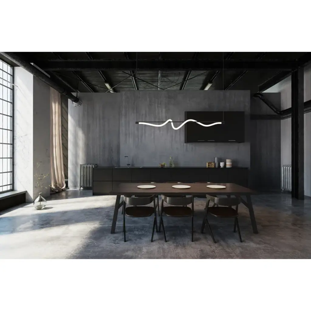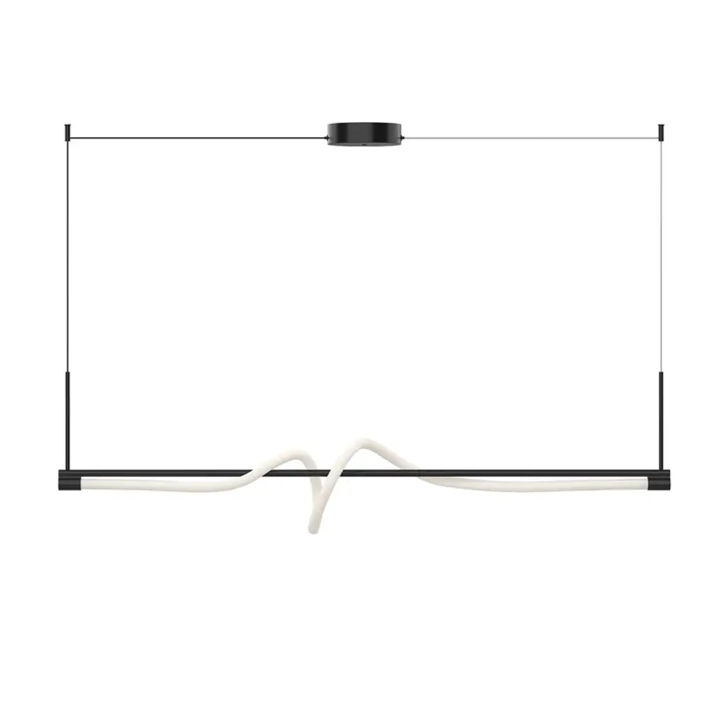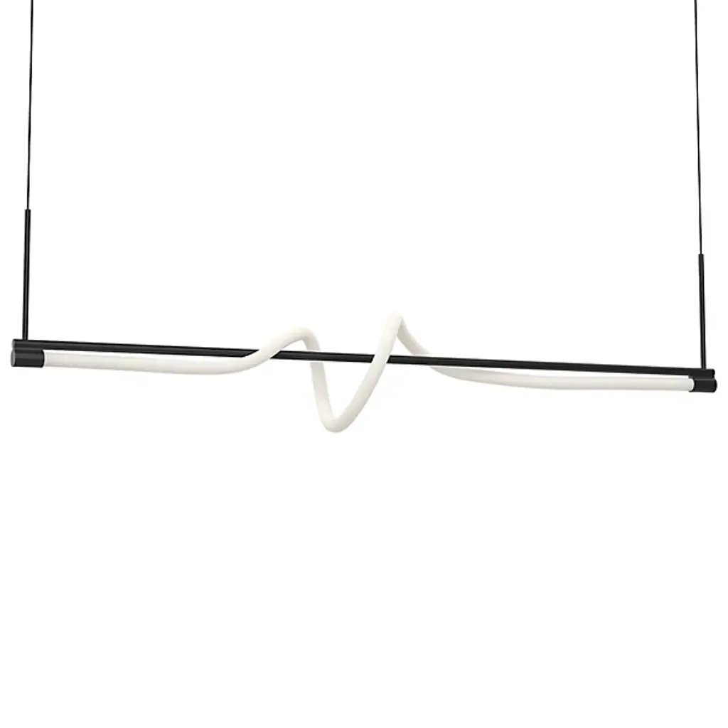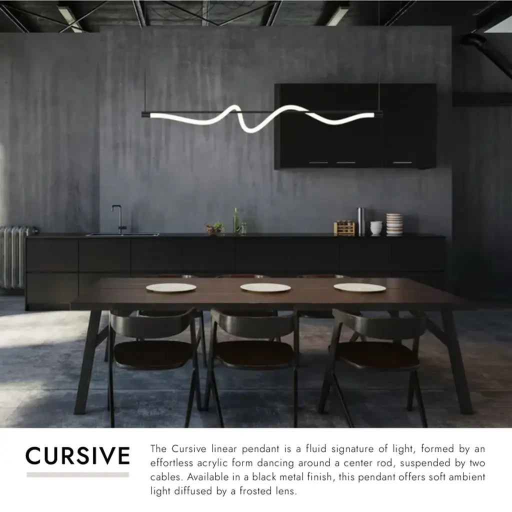 The Cursive linear pendant is a fluid signature of light, formed by an effortless acrylic form dancing around a center rod, suspended by two cables. In a black metal finish, this pendant offers soft ambient light diffused by a frosted lens.