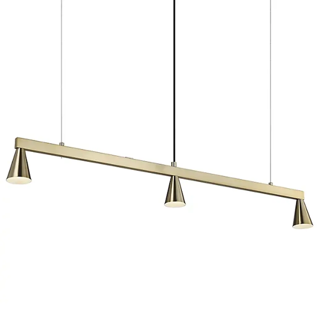 Price is for a signal linear pendant with brass shades and accents. This piece is customizable so we can also make the finishes per order to your spec. Lamping: G8 LED Bulbs (included)Canopy: Black, 5in Diameter, .25in height4x G8 LED bulbs included (2 per shade)24w, 2400 Lumens, CRI 90+