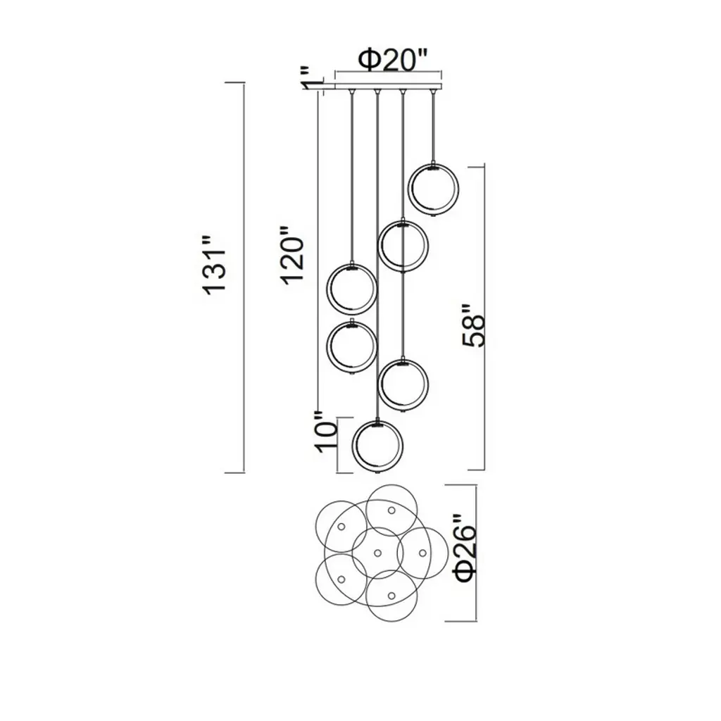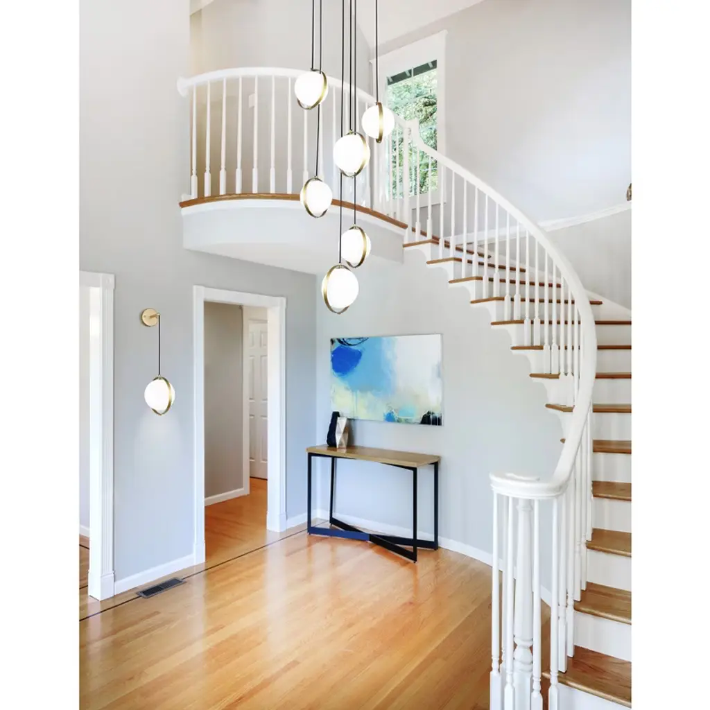 Bring a brilliant modern style to your space with the Da Vinci 6 Light Chandelier in Brass. This multi Light pendant features a cluster of white frosted glass orbs with each orb enveloped by a golden ring. This luminaire can beautifully illuminate a stairwell, a kitchen with a high ceiling, or an entryway