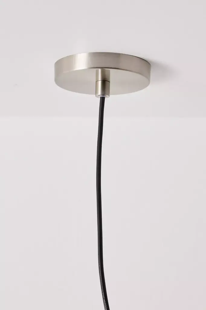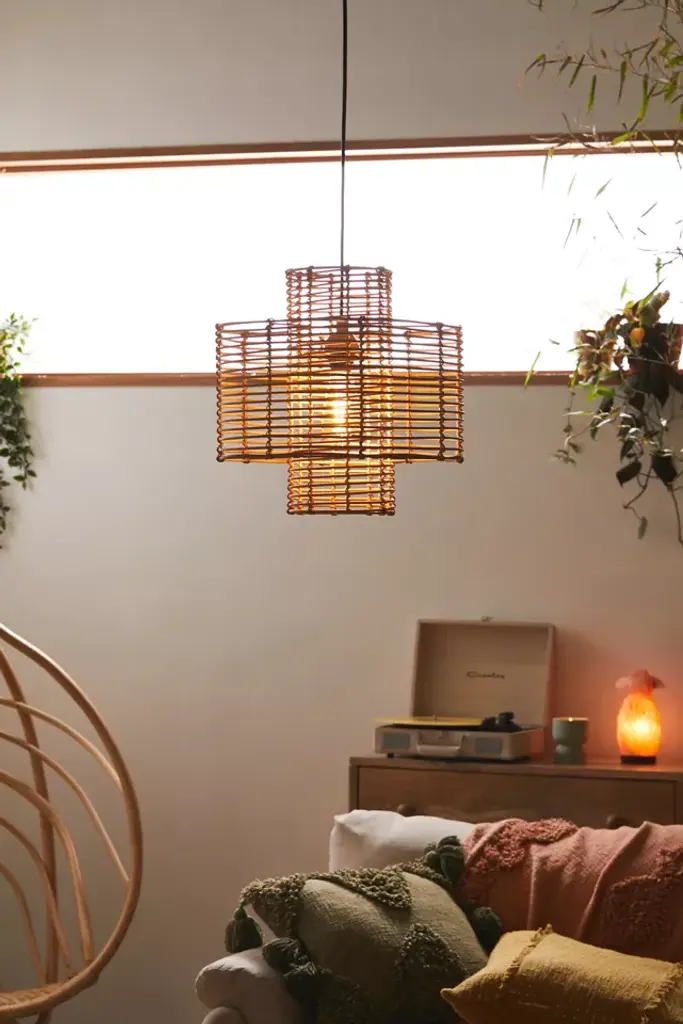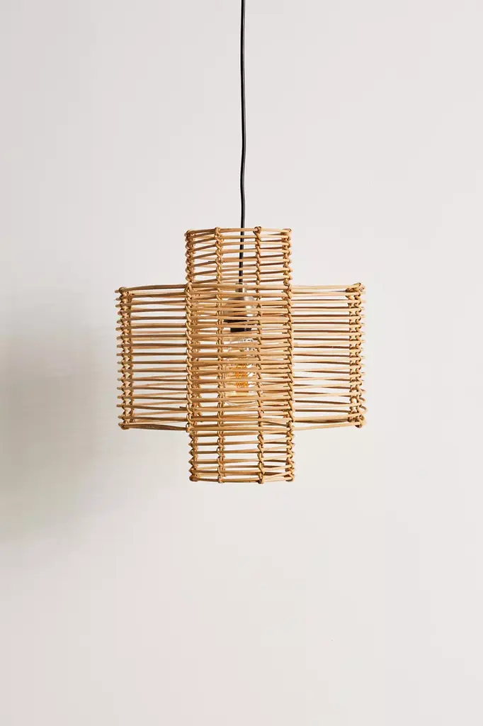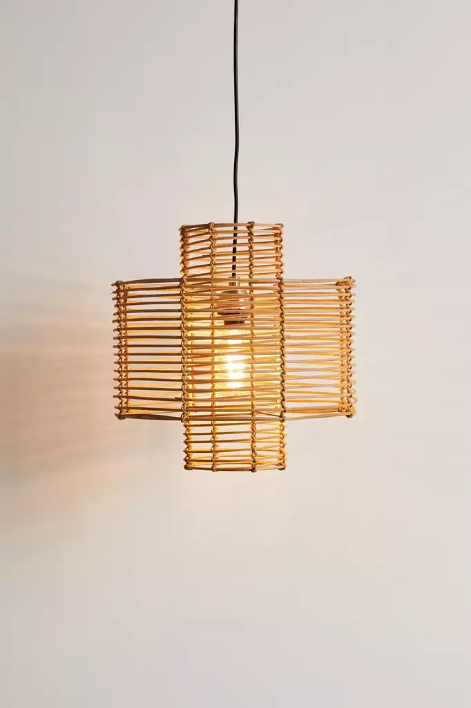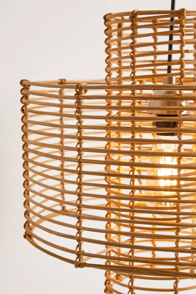 Structural rattan pendant light that offers a graphic, modernist take on boho materials. Hardwired design features two cylinders of caged rattan strands supporting by a metal frame.