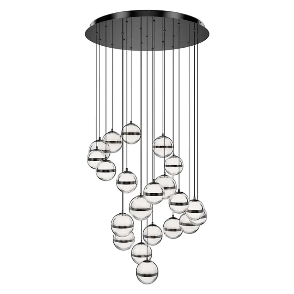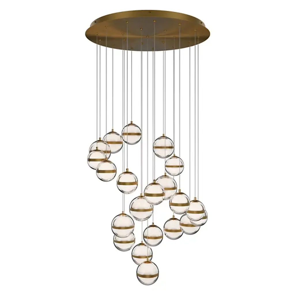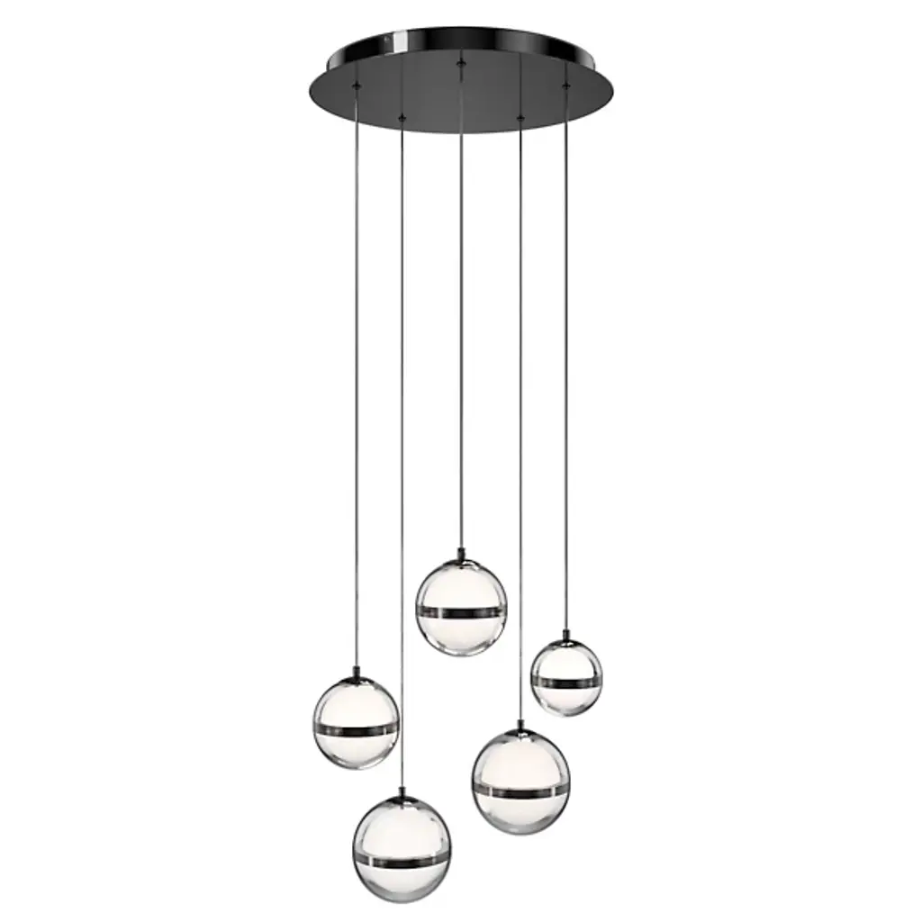 The Cyllindra LED Multi Light Pendant from dweLED features clear glass spheres bisected by horizontal metal bands that wrap around each globe's widest point. The aluminum strips create an equatorial division, separating each orb into distinct hemispheres. This banded treatment repeats across multiple pendants, which can be mounted to canopies of different shapes for clustered installations. Each sphere in this multi-light suspension maintains its individual character while contributing to a larger constellation of divided forms.