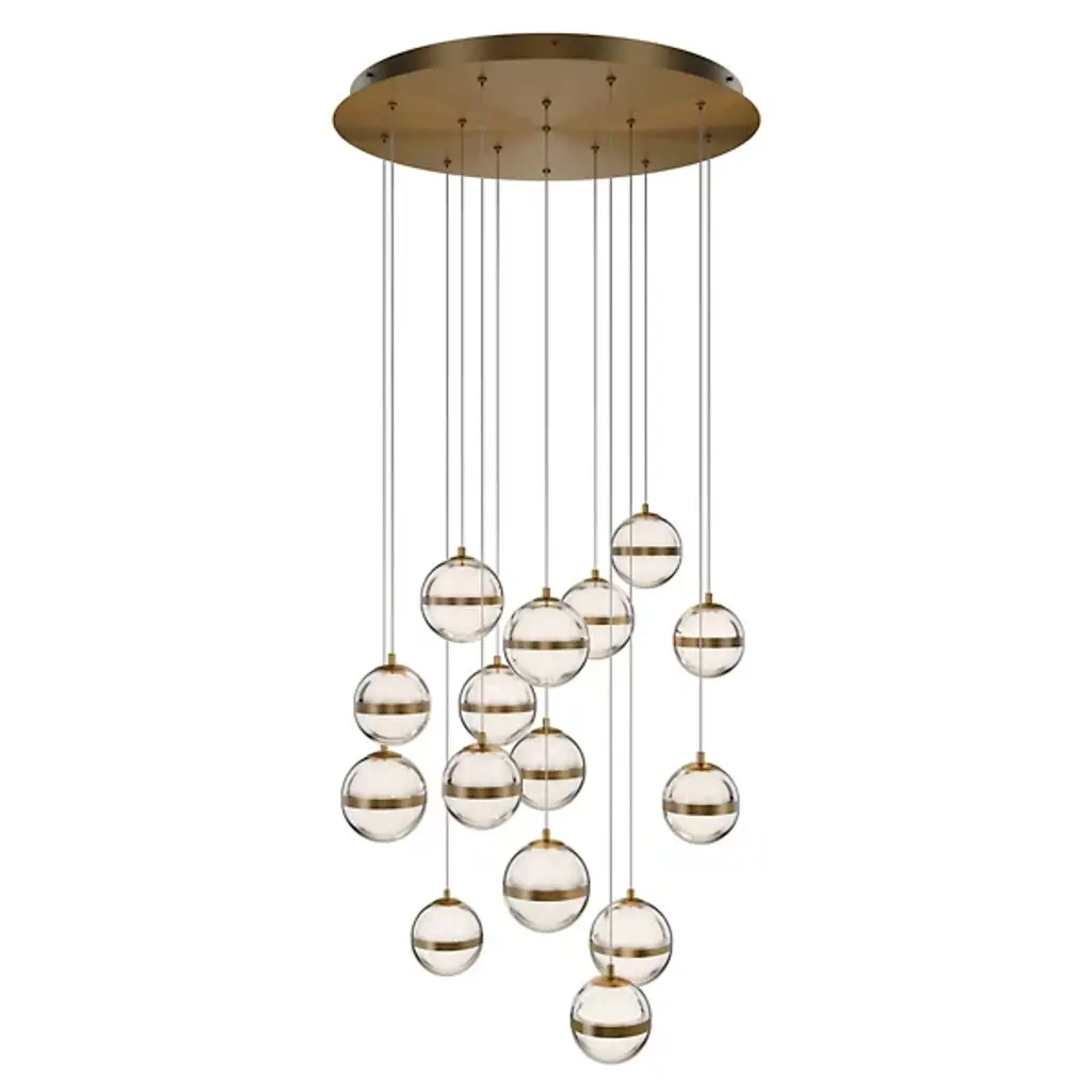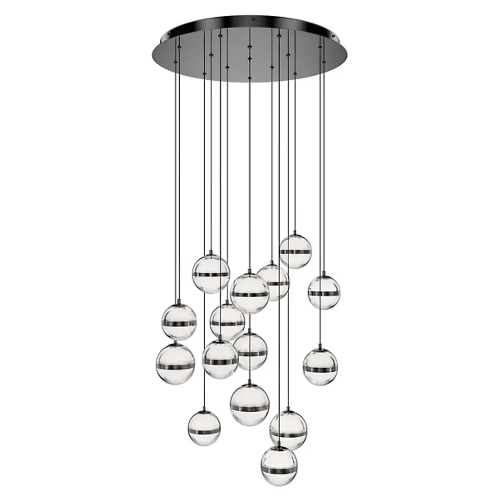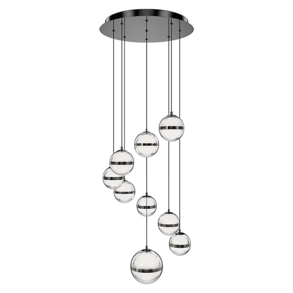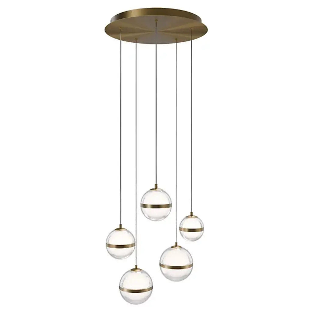 The Cyllindra LED Multi Light Pendant from dweLED features clear glass spheres bisected by horizontal metal bands that wrap around each globe's widest point. The aluminum strips create an equatorial division, separating each orb into distinct hemispheres. This banded treatment repeats across multiple pendants, which can be mounted to canopies of different shapes for clustered installations. Each sphere in this multi-light suspension maintains its individual character while contributing to a larger constellation of divided forms.