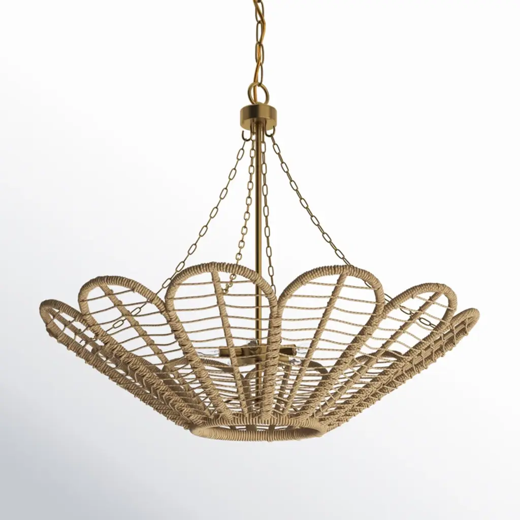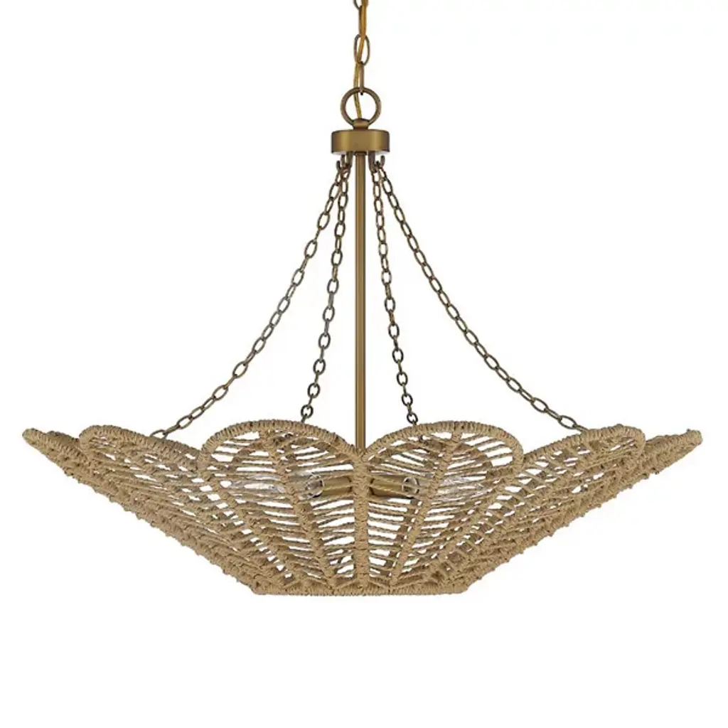 With a look recalling the iconic style of rattan furniture, the Savoy House Cyperas 5-light pendant brings organic-inspired style to your home. Its structure, which is flower-like in shape, is wrapped in rope and finished in warm brass. It is 22" in height and 30" in diameter. It uses five candelabra size bulbs of up to 60 watts per bulb. Comes with 120" of chain and 144" of cord.